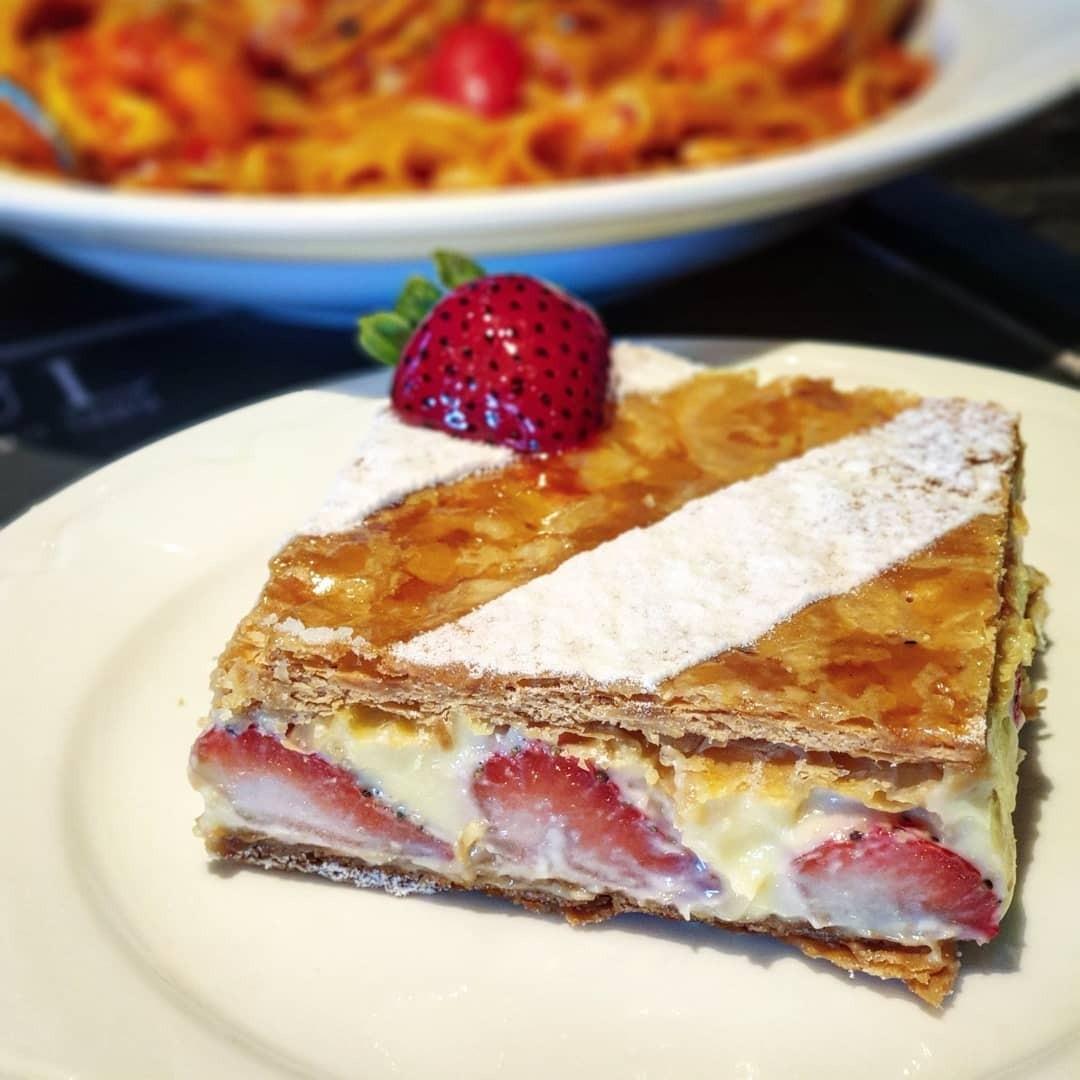 PAUL 保羅麵包法式烘焙餐廳_ 每個人一生都需要吃過一次的草莓千層派🍓 之前都是外帶這次難得來內用順便吃點鹹食💕 📍草莓千層派NT225_ 📍義式西西里海鮮茄汁扁麵NT410_(套餐+100,130飲品任選) 📍焦糖瑪奇朵NT160_ 草莓千層派很好吃🍓 但我要說的是義大利麵也很棒👍 份量超多,茄汁很入味海鮮也很新鮮🎉🎉 是吃得飽的下午茶🎊 - 🏠台北市大安區仁愛路四段107號 . 📢不過用餐90分鐘有點短 - #台北美食 #台北下午茶