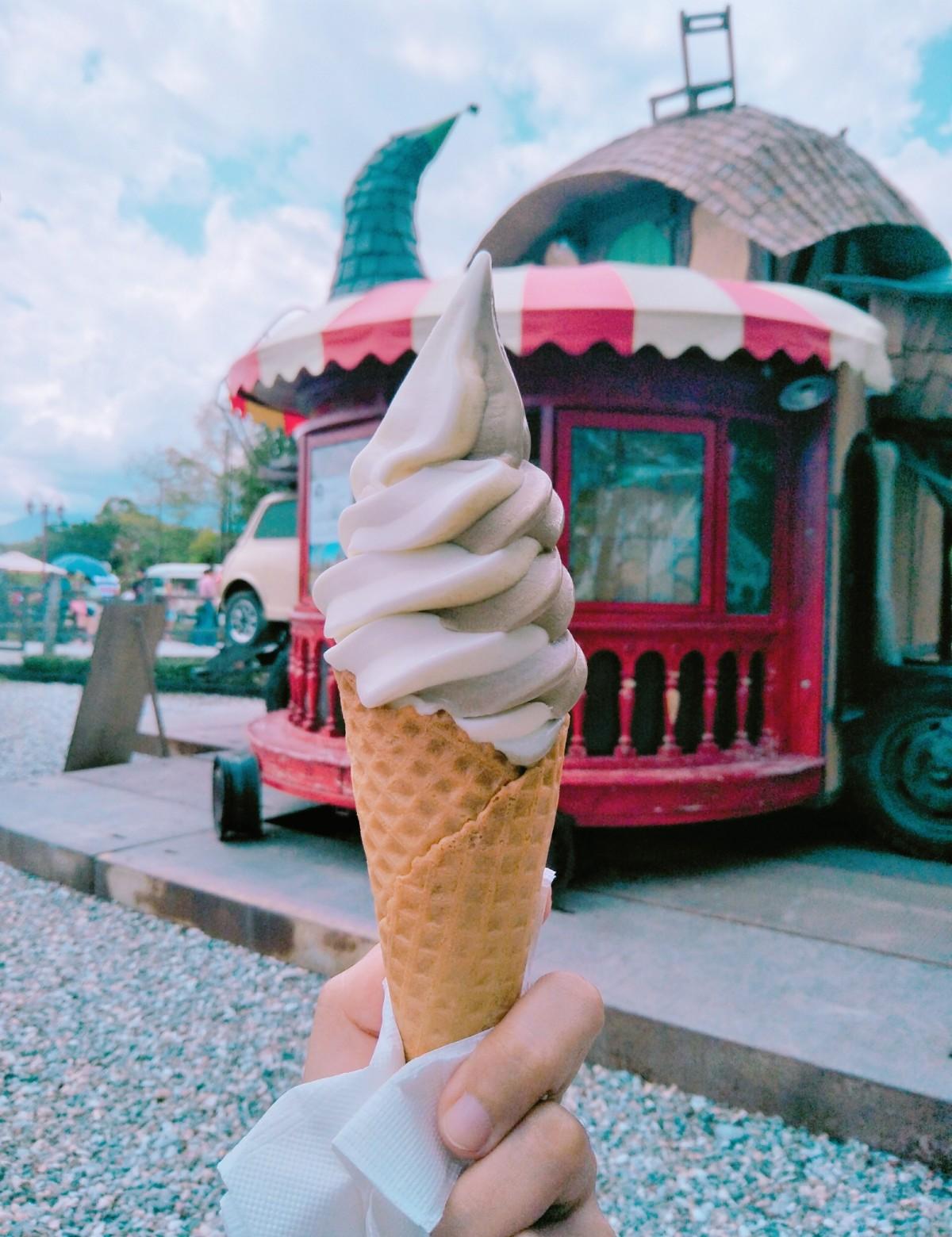 許多人打卡的地點,主要賣氣泡飲,咖啡,新增點心奶酪,馬卡龍,但見新的餐車,一面賣冰,是有變化的口味霜淇淋,一面賣包子,頗有創意。