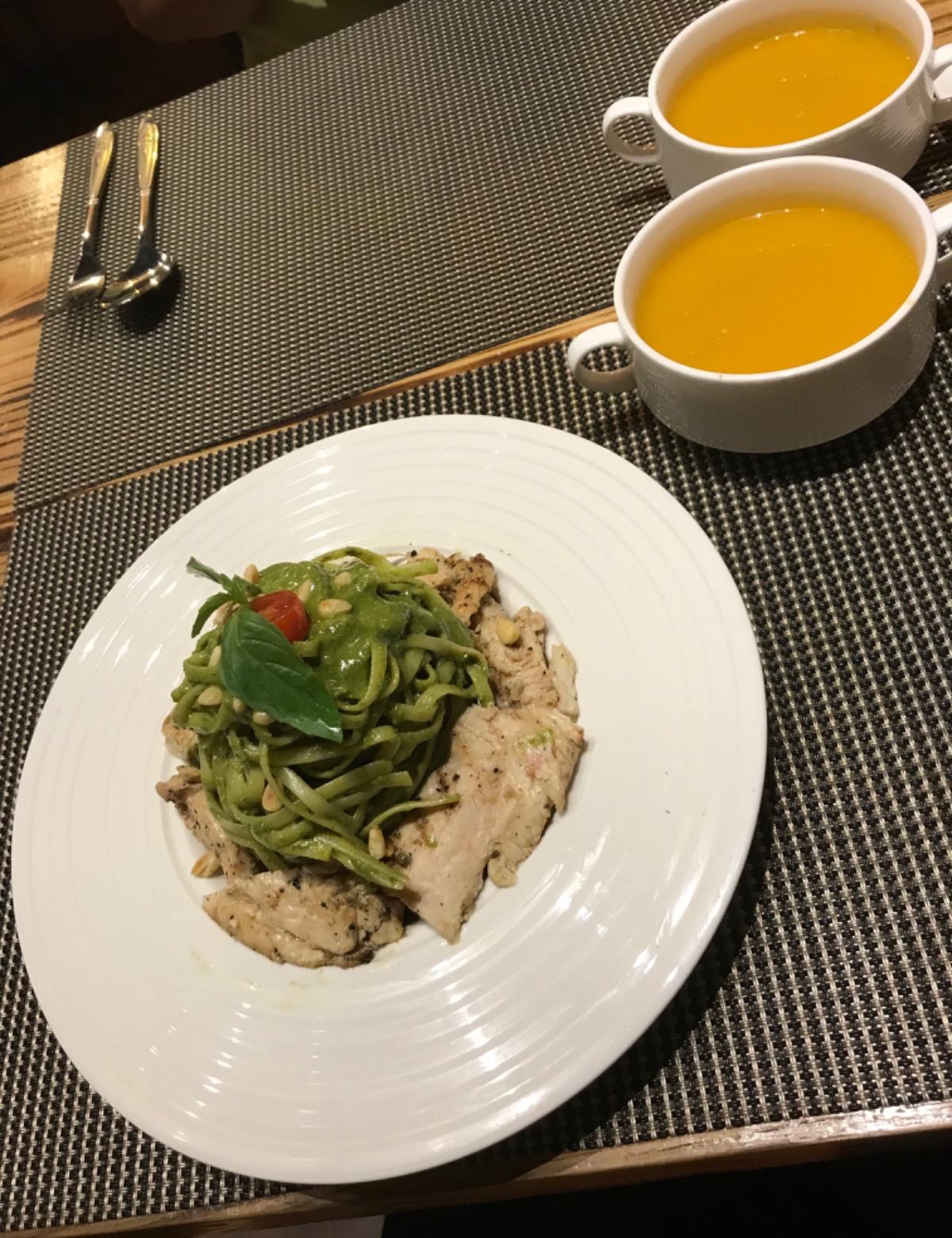 是南瓜濃湯!本來超不愛南瓜ㄉ我全部喝完還差點把碗拿起來舔😥上面還撒了檸檬皮的屑屑(?)所以喝起來不會膩反而很清爽~希望下次來ㄉ時候會喝到羅宋湯🤤
