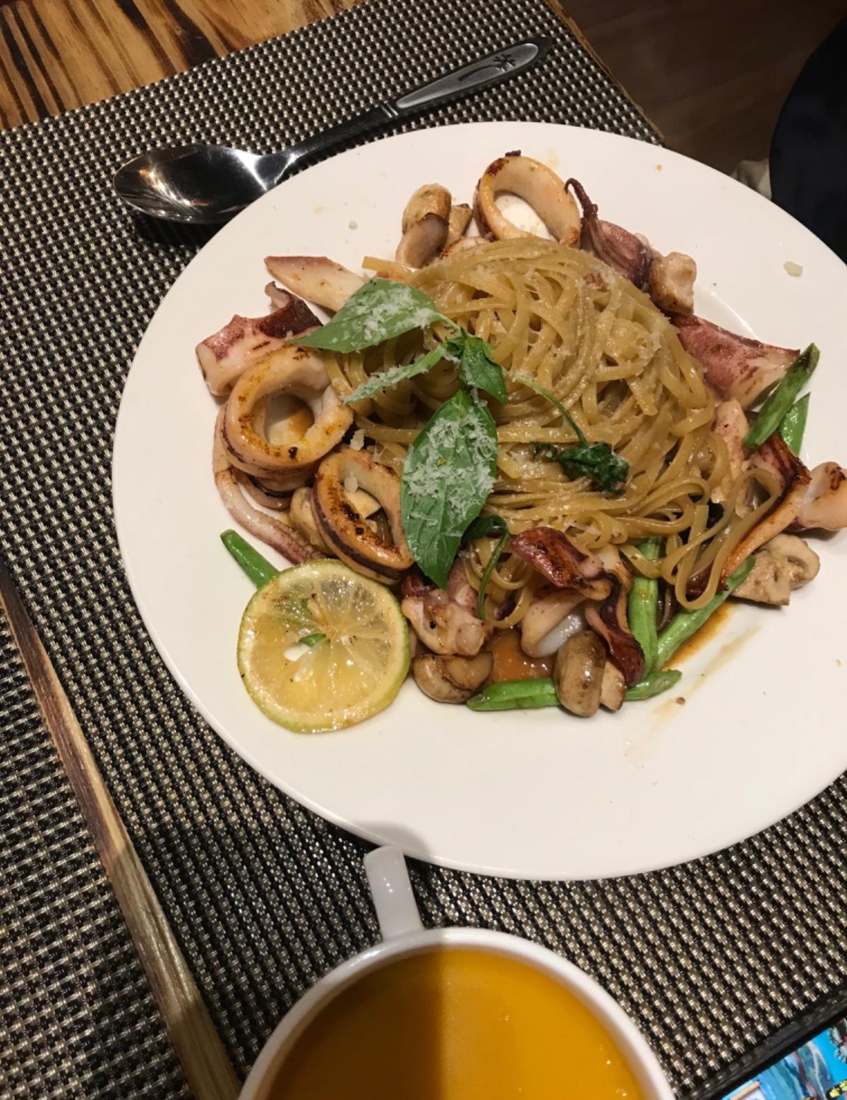 盤子上滿滿的透抽先幫這盤麵加了10000分!細扁麵吃起來比剛剛普通的麵多了特別的口感,蒜辣ㄉ部分倒是沒啥感覺😓湯汁都被收在麵裡了所以比較乾一些~