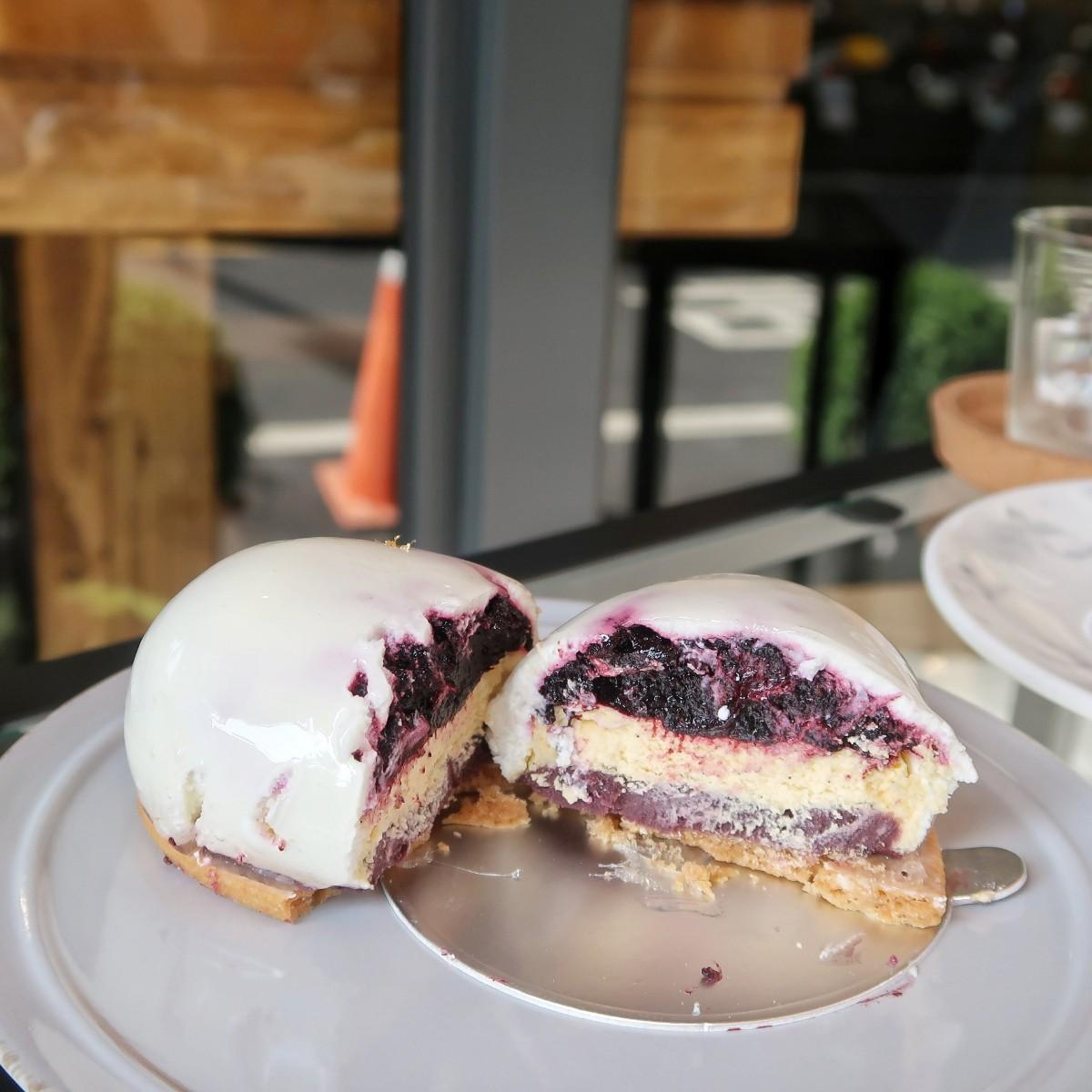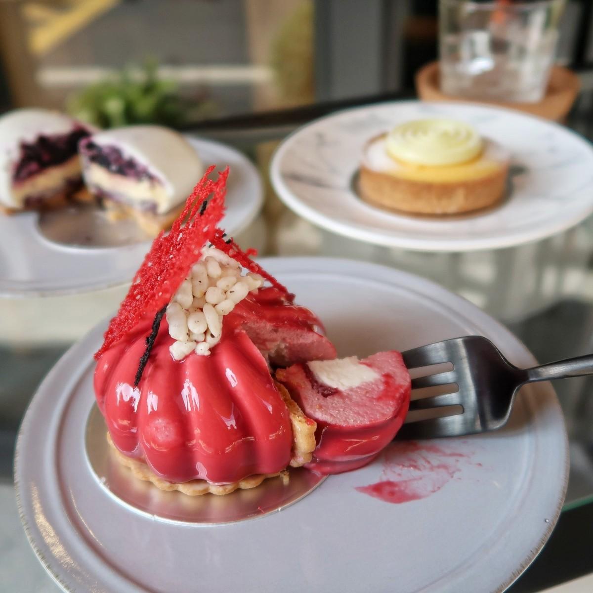 選擇性障礙看到藍莓就決定是他了!外層白巧克力淋面內餡有馬茲卡彭、卡士達及藍莓醬,帶點酸酸甜甜底層的餅乾增加口感是加分的原因。美美的珊瑚是由草莓、覆盆子、羅勒組成,不僅美又好吃🤤檸檬塔檸檬足夠順口涮嘴,推薦點杯冷泡金萱搭配著吃🤤