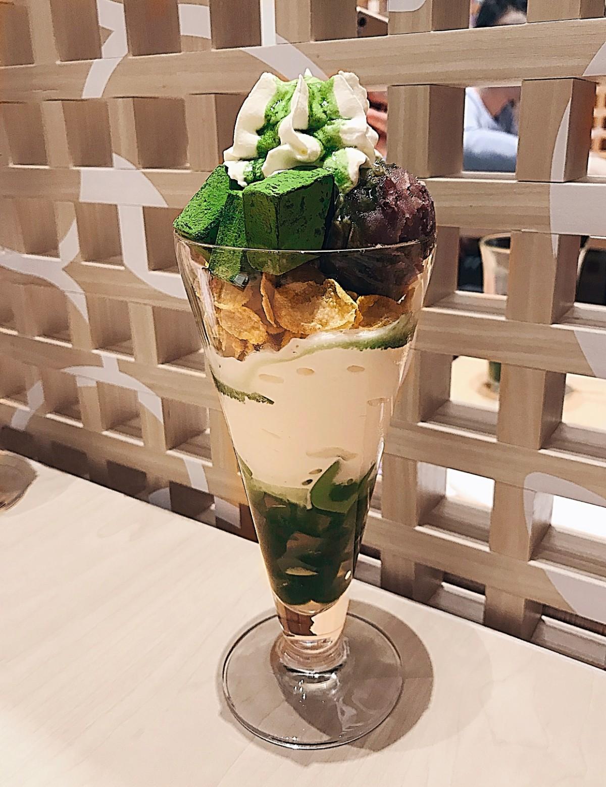 含有鮮奶油/抹茶蜜/抹茶冰淇淋/抹茶生巧克力/蜜紅豆泥/玉米片/抹茶凍,濃濃抹茶香的冰淇淋配上蜜紅豆泥應該是抹茶控的最愛,加入酥脆玉米片混搭的吃法也很新鮮,但我覺得淡抹茶生巧克力有點過甜,幸好底層的抹茶凍是比較爽口的,不會讓人整杯吃完覺得只剩甜膩感。