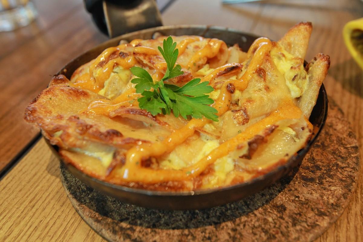 馬鈴薯烘蛋是很多人推薦必點,剛上桌就很吸引我的目光,一種我很高熱量所以很好吃的狀態,上面舖著厚厚一層切片的馬鈴薯,炸的外層酥脆內層綿密,用叉子劃開下層的厚實的烘蛋,從切口的蒸氣聞到濃厚的蛋香氣,馬鈴薯跟烘蛋配上美乃滋,一口下去我就覺得沒點錯,好吃!我也要加入必點行列。