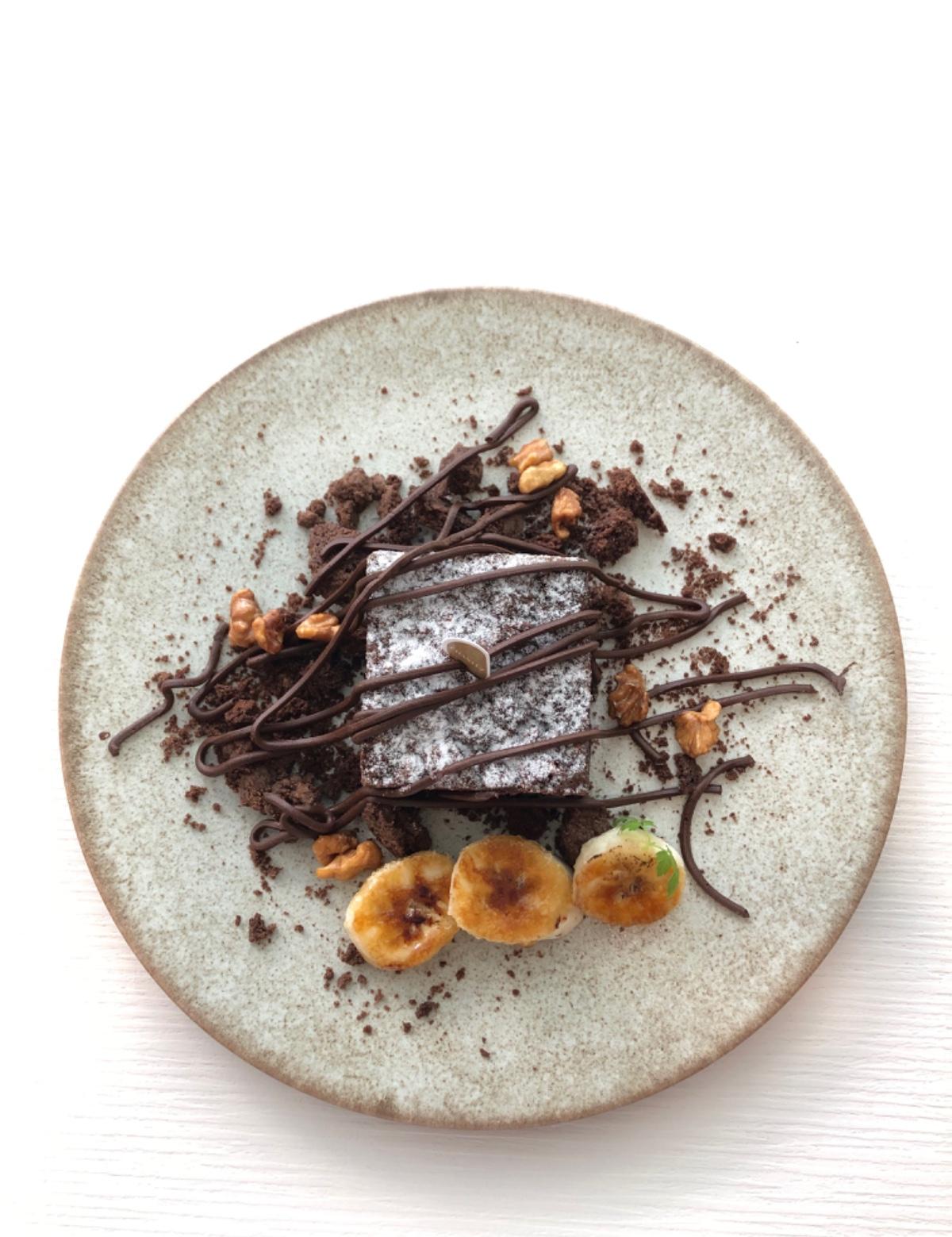 布朗尼的部分稍甜一些,但周圍一條一條的是苦的巧克力,配在一起吃剛好中和掉原本稍甜的口感,再搭配旁邊的餅乾跟香蕉一起吃真的會讓人一口接著一口😍