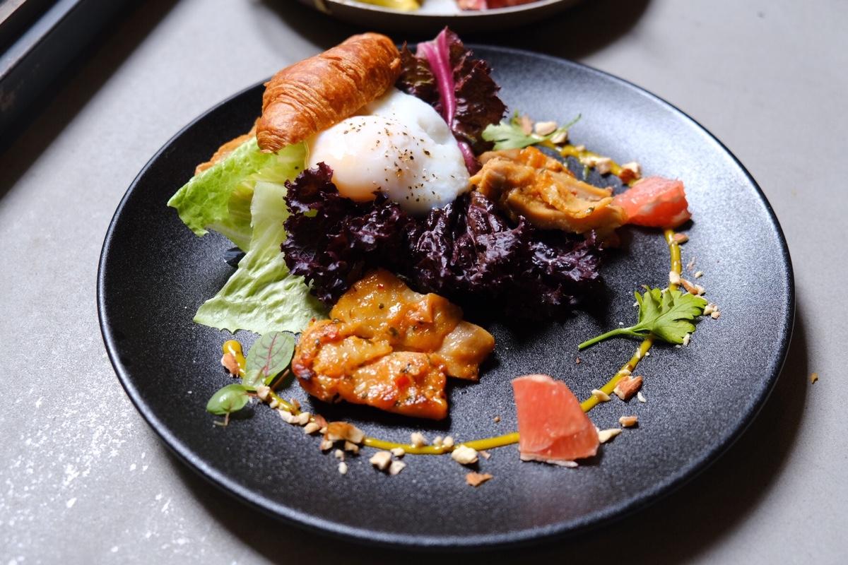 用餐區域就位在天井的旁邊,對了這邊的餅乾糖果和茶水是無限量供應的.早餐依然不馬虎,好喜歡它黑色霧面餐盤,質感整個大大的提升,早餐加價購為$99哦
