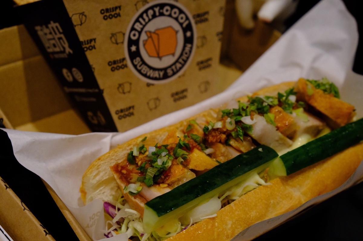 豬五花需要三天的時間熟成,再以烤的方式將油脂逼出來,豬皮烤至酥脆。蔥花、蒜頭、醬汁的調味偏鹹,不過搭上潛艇堡+小黃瓜可以降低鹹度,挺不錯的
