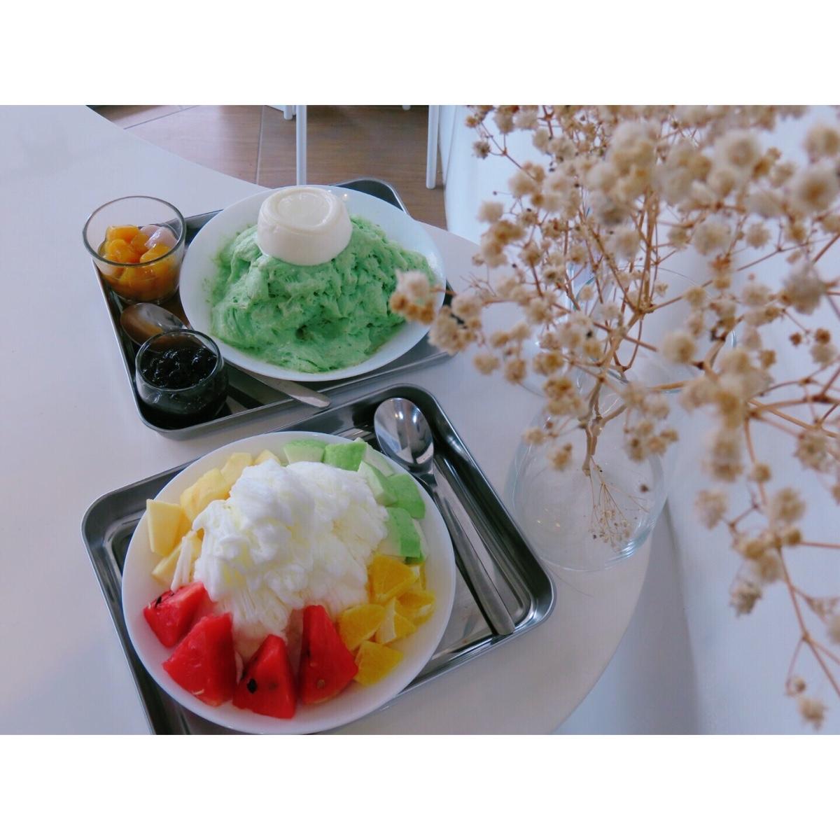 綜合水果雪花 • 90 抹茶雪花 -粉圓、芋圓 • 75 普通冰類價錢均在50! 超平價的❤️ 打卡送奶酪,店內採光明亮 因為很美,拍到冰都快融化了🥳