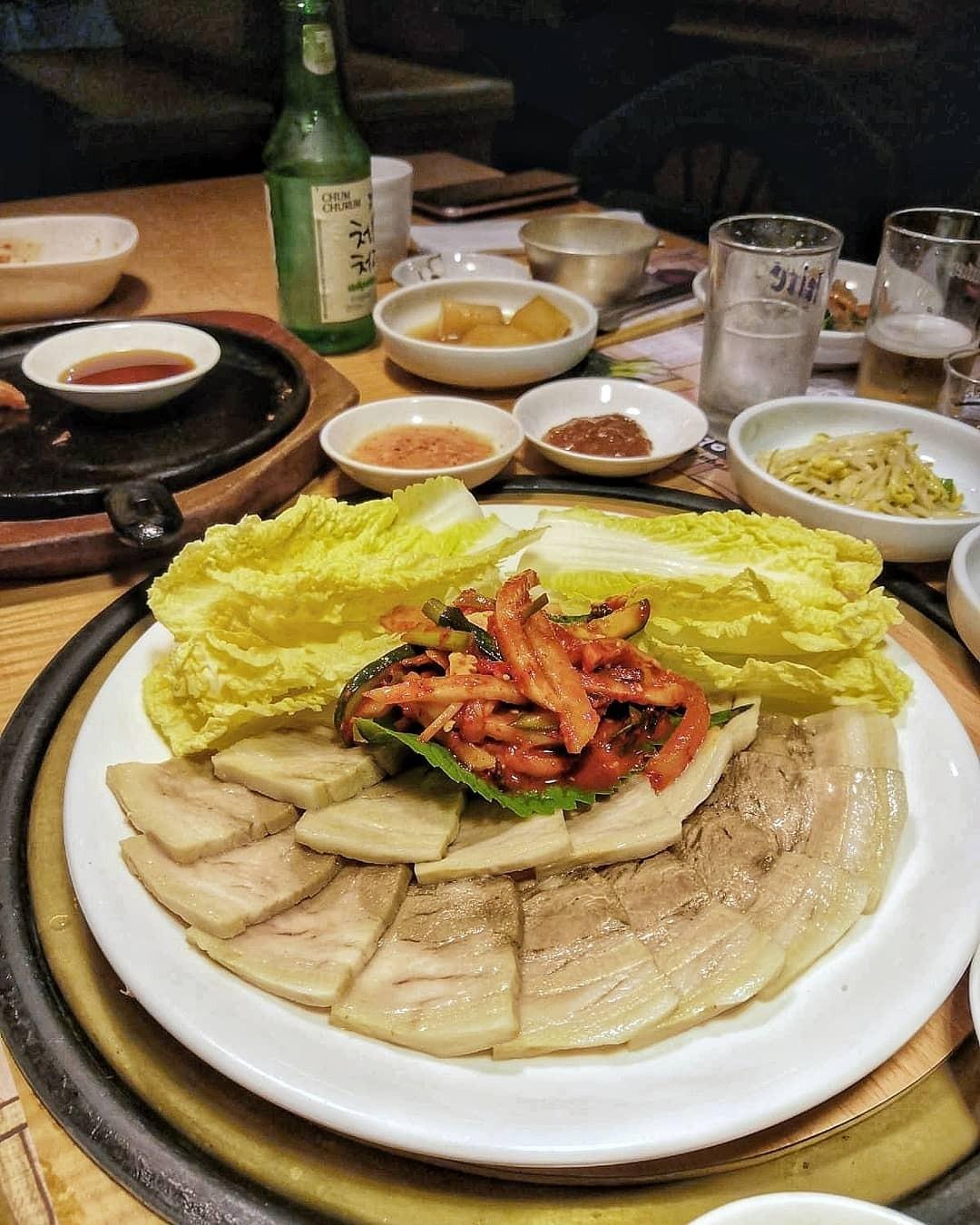對韓國飲食文法熟悉的人,應該知道前菜的重要性。當你還點餐前, 侍應會把不同的前菜端到桌上,有泡菜、菠菜、芽菜、豆腐、土豆等。還有他們的泡菜有兩款,一款是即日醃製,而另一款是隔離醃製的,辛辣程度及口感不一樣,個人喜歡即日醃製泡菜,較爽脆及酸辣味鮮明。