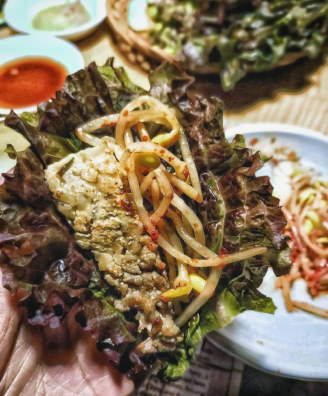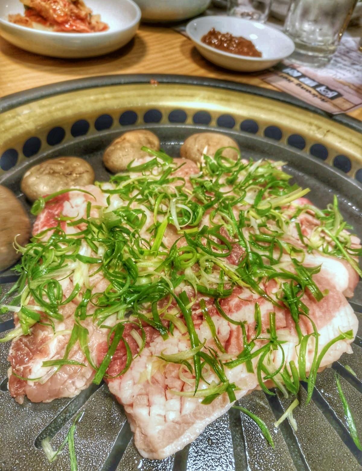 烤肉時加上蔥絲,令五花腩更香口惹味,烤好後配上辣大豆牙菜沙律,塗上醬料再用生菜包好,大口一咬,認。真。超。美。味。啊~