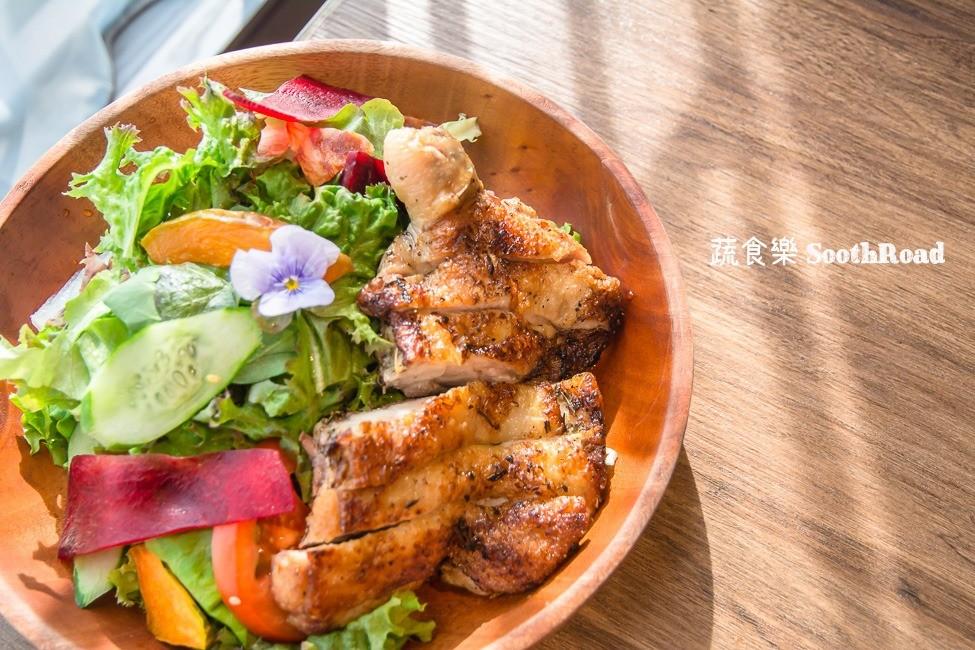 嫩煎迷迭香雞腿排佐法式凱薩醬,這超澎拜的沙拉搭配上繽紛得蔬菜,讓人看了胃口大開啊!前面跟大家提過,蔬食樂的生菜都是自產自銷的,