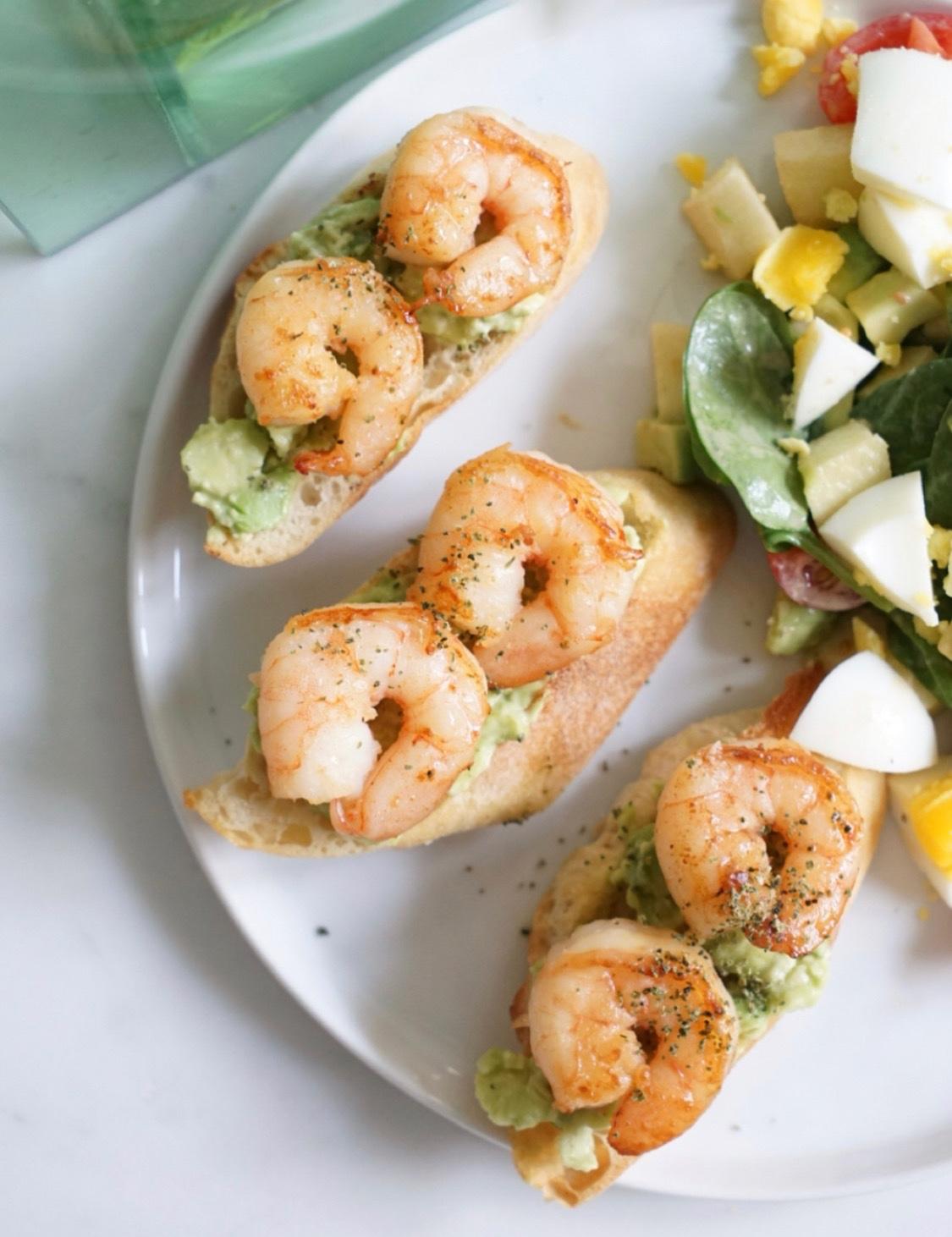 🥖 簡單的食材就可以創造出可口美味,看似精緻高檔的料理。 今天就來介紹早上製作的早餐料理 奶油香煎蝦仁🍤 烤法國吐司切片塗牛油果醬🥑 清蔬沙拉🥒 拍照的秘訣就是要一個又白又大的盤子🍽