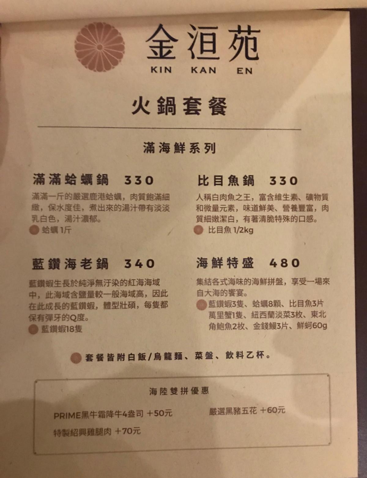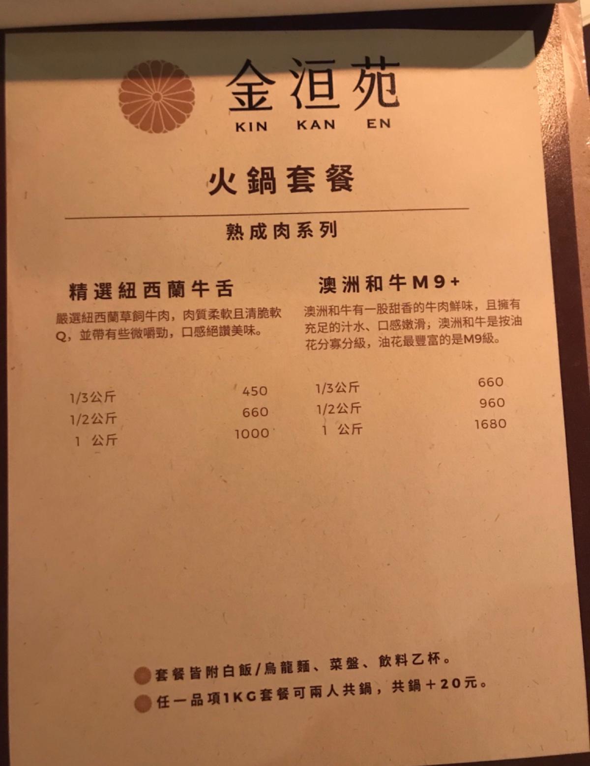 中午跟同事路過,眼尖同事發現高級餐廳有火鍋套餐280元,立馬進去詢問😊霜降牛肉1/3公斤的肉套餐才280元,超級划算的❤️我們立馬開鍋!兩人用餐可以選鴛鴦鍋不同湯頭,不加價喔!我們點霜降牛肉280元(外加一成服務費)與油花較少牛背肩300元(外加一成服務費),老實說,我們本是大胃王來著的,肉真的吃到撐啊😢建議兩人來可以一人點海鮮一人點肉品,才不會那麼自虐~暈 他還有燒烤喔!下次再來嚐嚐😊 #火鍋#冬天美食#牛肉#燒烤#國父紀念館站 金洹苑日式燒肉鍋物放題 地址:台北市延吉街131巷31號