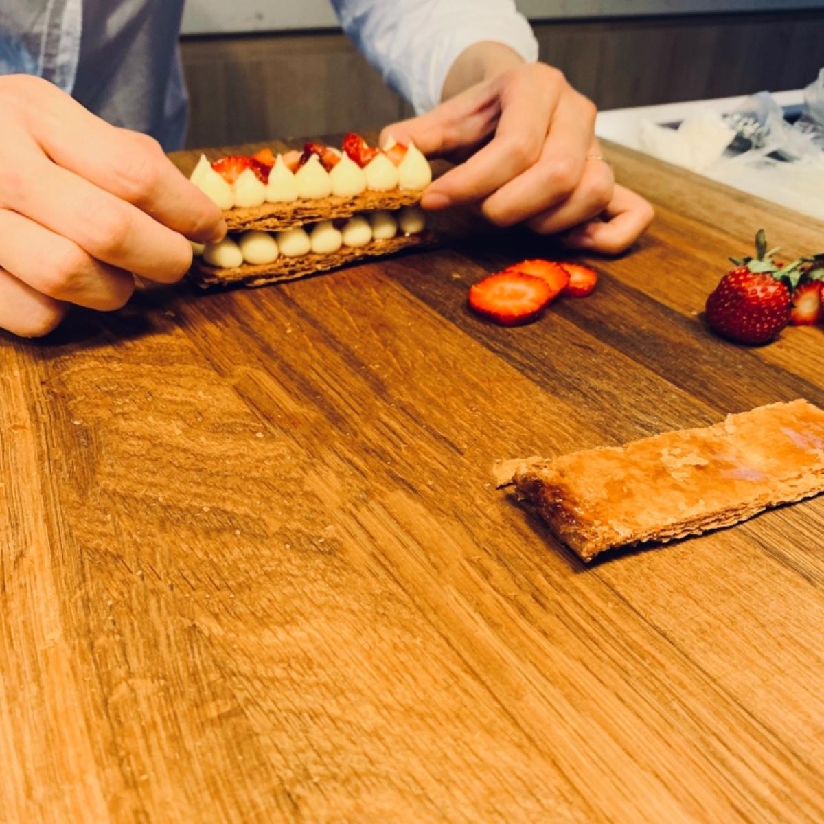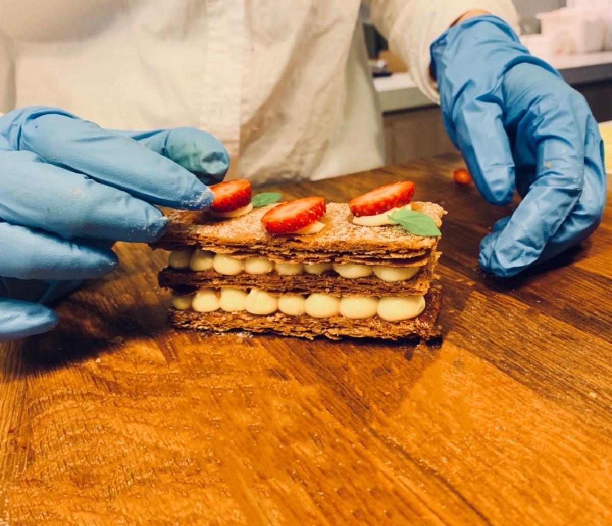 用蜂蜜蜜製草莓後,鋪滿整個千層派皮