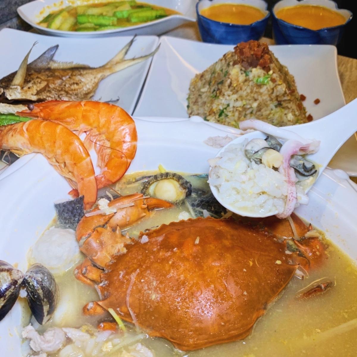 滿載粥有珍珠貝、紅蟳、九孔鮑魚、蚵仔、蛤蜊、虱目魚皮、魚肉、小卷、鮮蝦手工虱目魚丸,料也太多了! 重點是連蝦子都肥美又鮮甜,螃蟹是「紅蟳」耶!一剝開裡頭滿滿的蟹黃跟卵,真的要吃到痛風了!