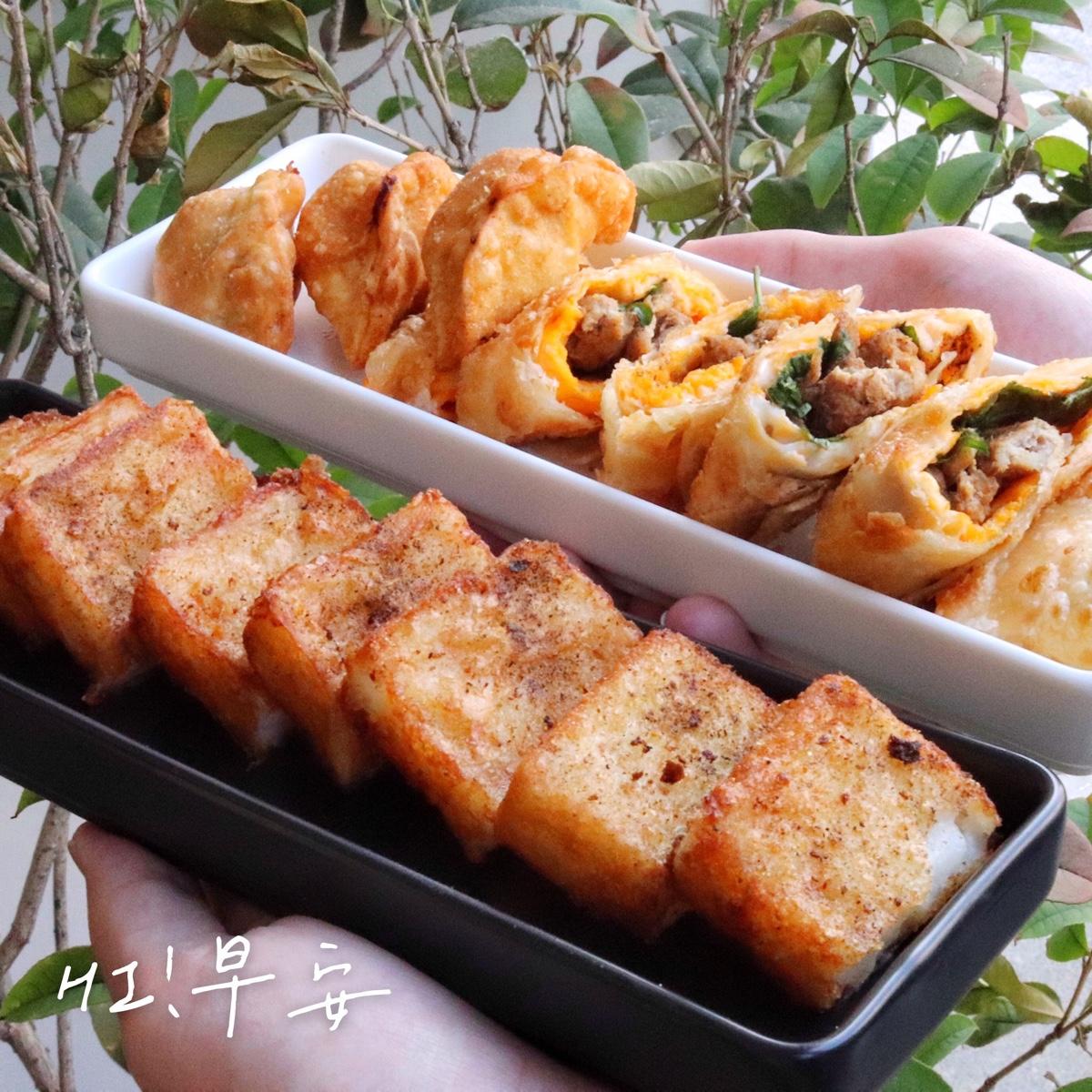 好少在早餐店吃到炸餃子,一份有五顆,外皮炸的金黃酥脆,裡面包著肉餡和玉米,很特別