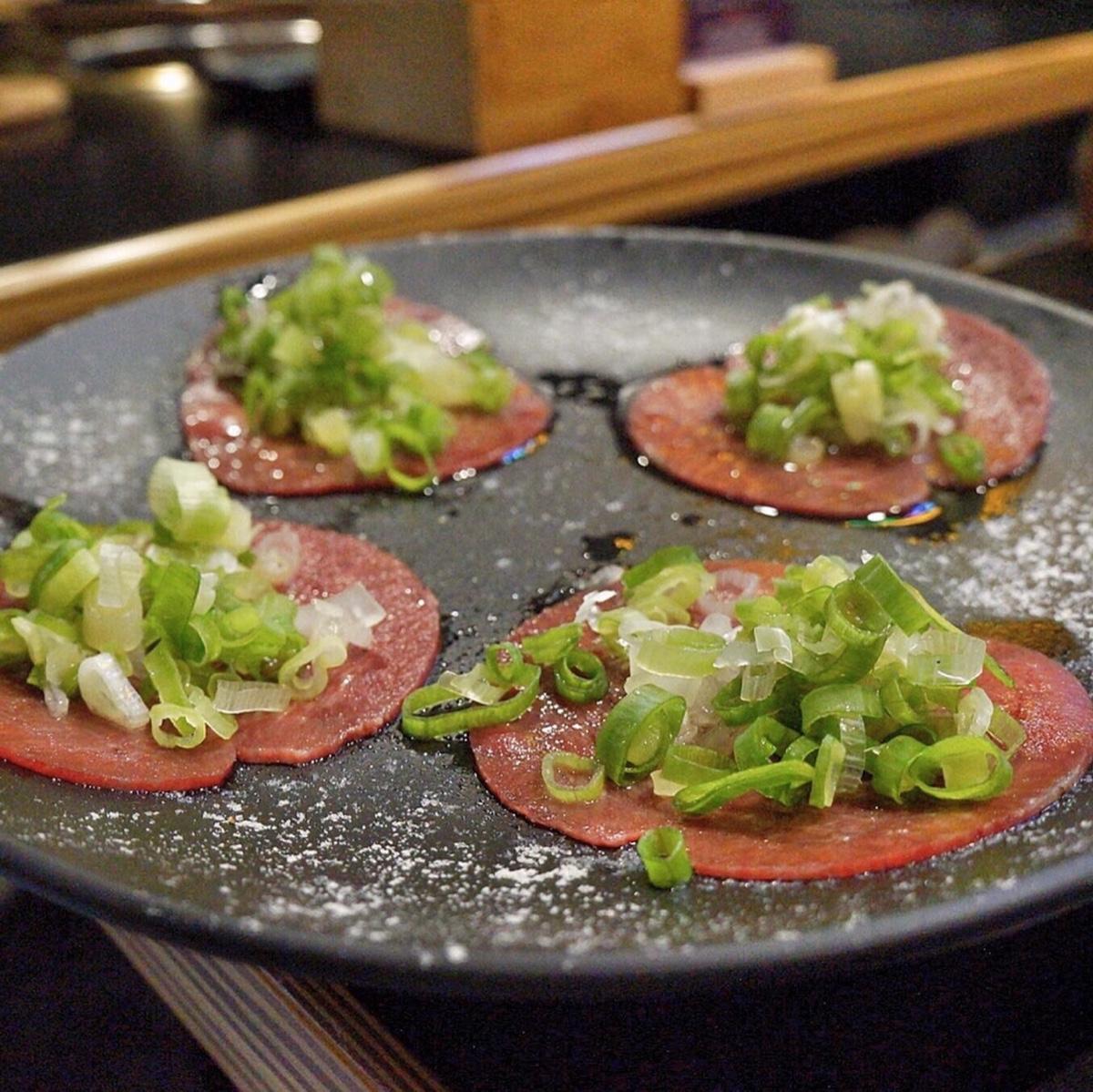 我最愛的一道啦~❤牛舌!! 烤薄牛舌配上滿滿的蔥花,約5分熟烤單面就可以吃了,可以吃到牛舌的爽脆感~