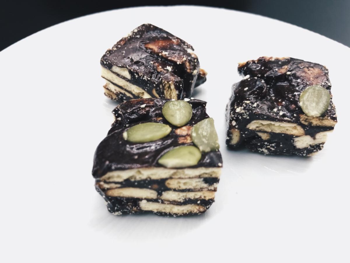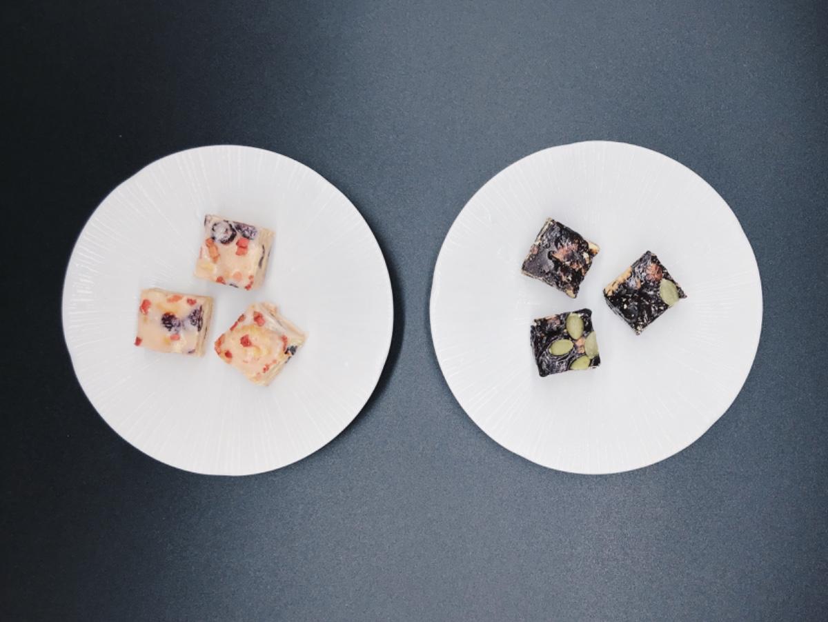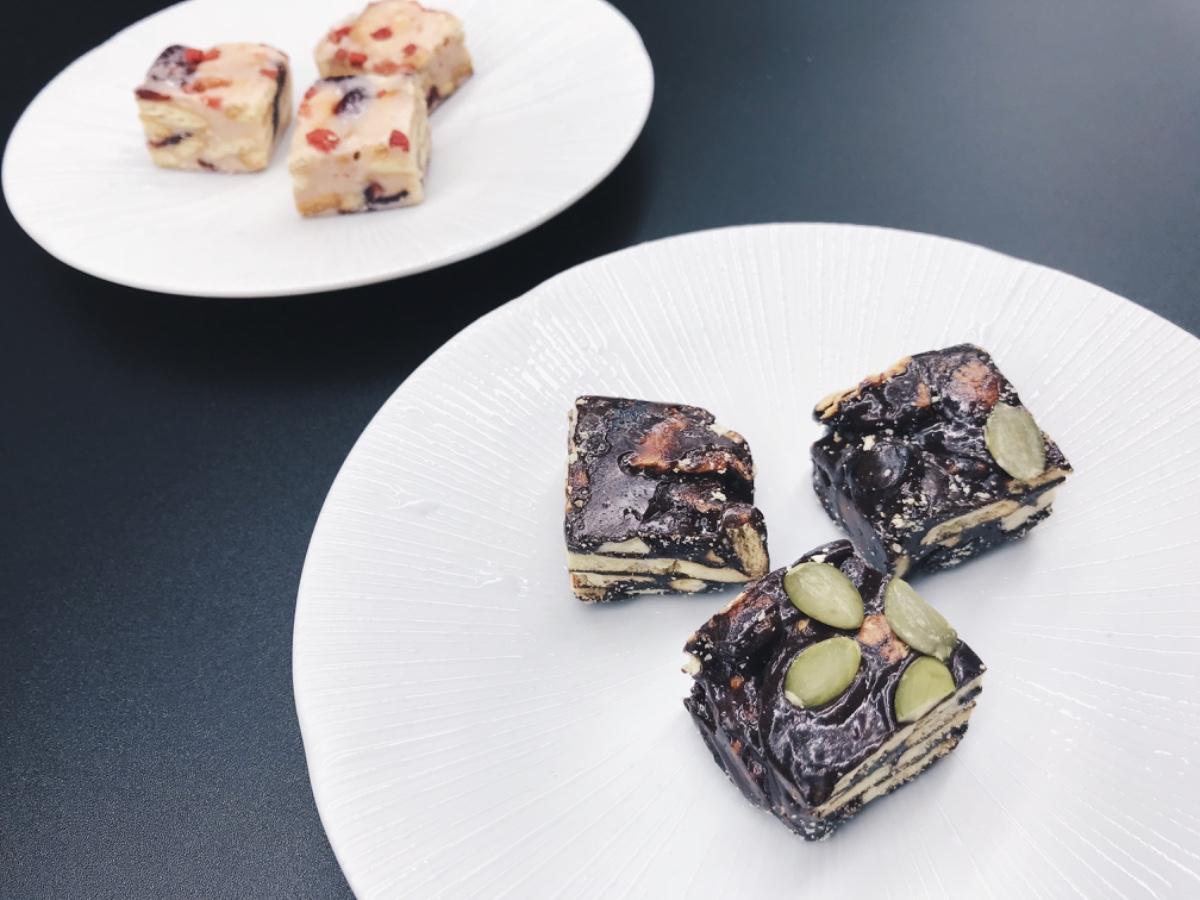 👉🏻巧克力蔓越莓:甜度較低,有濃厚的巧克力香氣。入口時先嚐到蔓越莓的微酸,再感受巧克力與奶油的溫潤,點綴的南瓜子相當稱職,增添層次感,就算連續吃幾塊,也不會覺得甜膩。