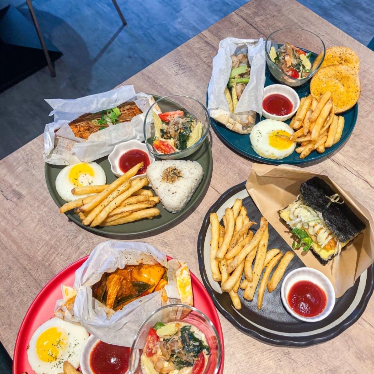 這天我們分別點了「韓式辣味烤豬五花」、「椰香紅咖哩雞腿丁」、「白酒香蒜蕈菇鮮蝦」此三種紙包餐,而我自己則是點了檸檬醬炸雞腿排飯糰。