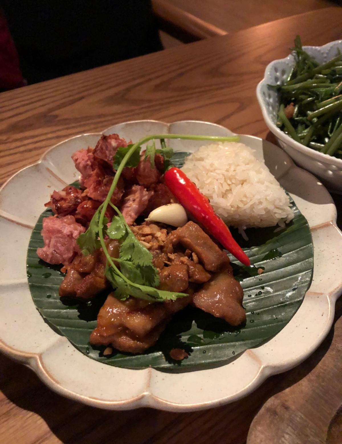 盤內兩種不同口味的鹹豬肉..配上旁邊的泰國米飯🍚..非常適合下酒菜
