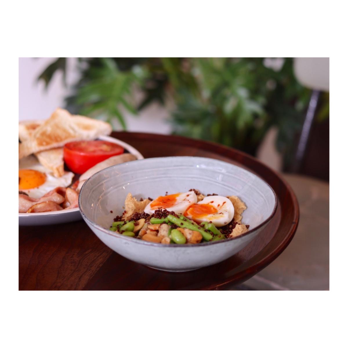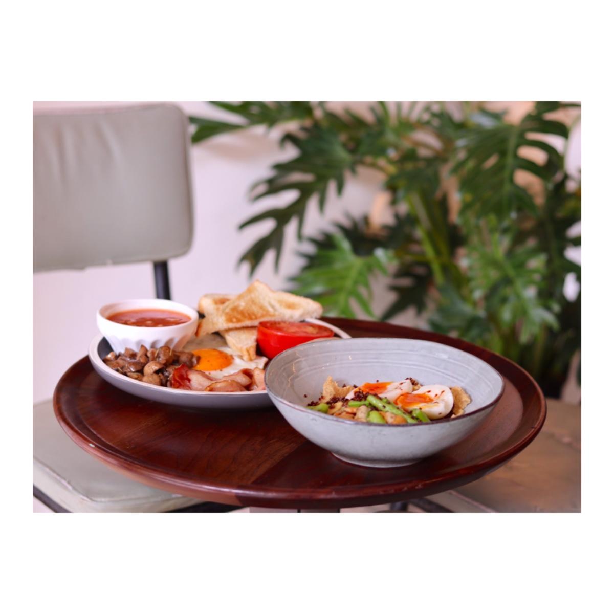 豐富的早午餐盤中,標準配備焗豆、牛番茄與培根等,樣樣都沒少,香腸也有別日常吃到的口味,燻香味濃郁,肉汁飽滿,吃完一整份也相當有飽足感。至於鷹嘴豆泥溫沙拉,也令人驚豔加入藜麥、蘆筍、毛豆和大量堅果,鷹嘴豆泥拌入檸檬芥末籽醬,酸味相當開胃,上頭再擺顆糖心蛋,高蛋白的一餐,營養又好吃!