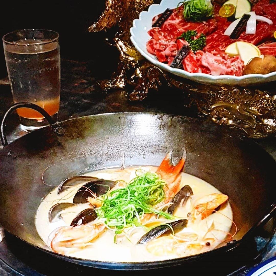 ( 海鮮饗宴: 原味鮮魚海鮮煲,飯後甜點,經典烤布丁,出水芙蓉,冰心綠豆糕)