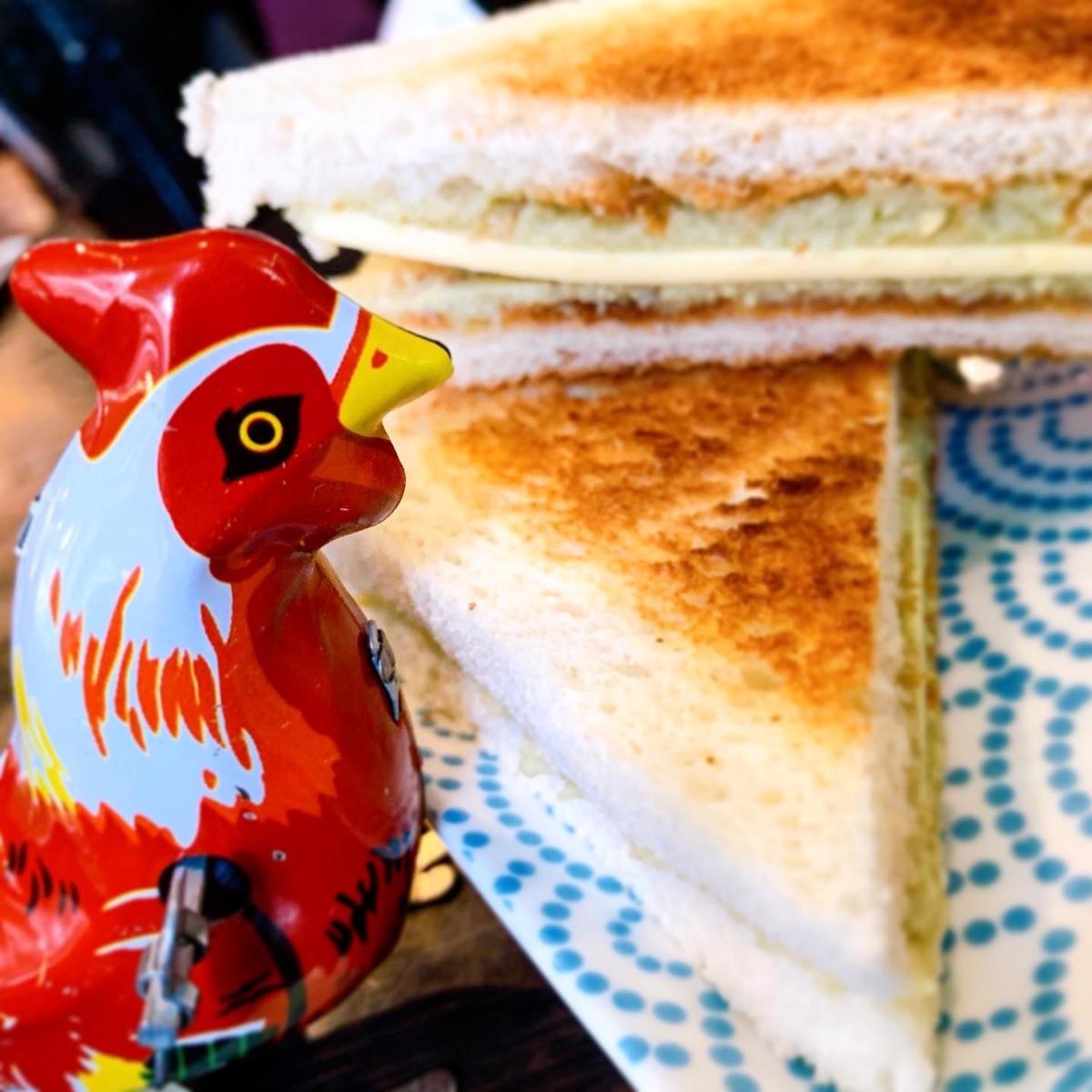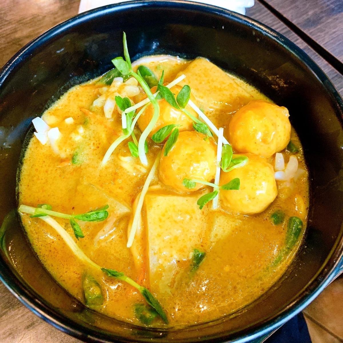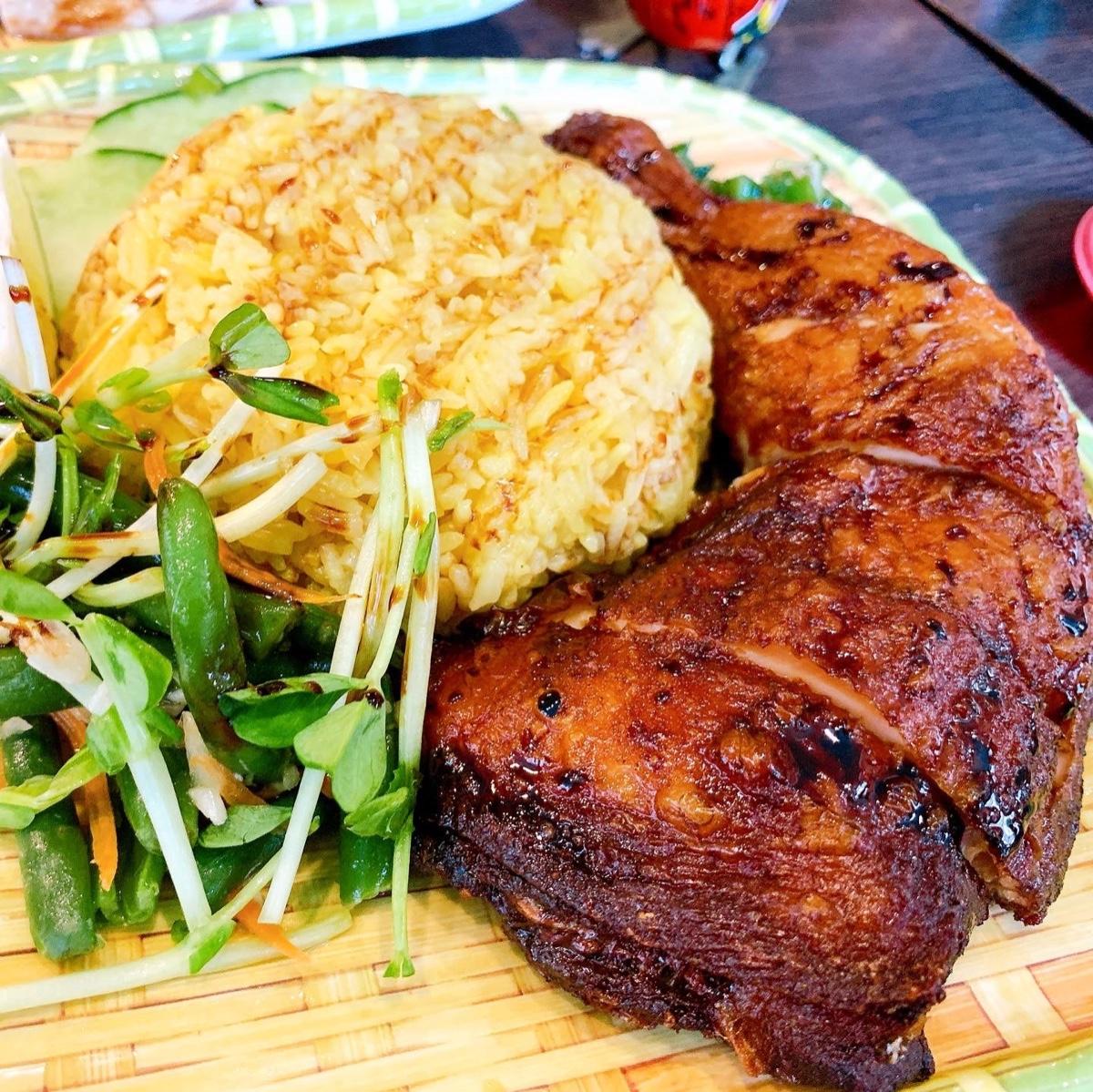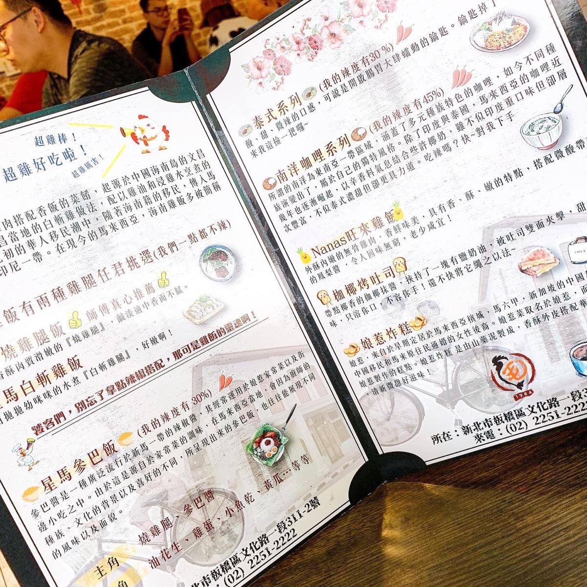 色香味俱全的異國風情,板橋新埔巷弄內近致理技術學院,小店面不過於醒目,店員態度親切可掬,這家販售星馬平價料理,復古黑膠掛滿牆上,熱門招牌有海南雞、星馬燒雞腿,座位還有可愛的雞抱枕跟小玩具特別討喜,上菜了!雞腿肉鮮嫩多汁,皮滑嫩而不油,擠上檸檬mix醬汁入味,連飯都有淋醬,美味可口可以把飯吃光光,一旁的蔥花也加分不少~咖哩魚蛋撈麵,濃稠醬汁微辣,星國道地口味加分,整體CP值高,燒雞色澤又讓人流口水🤤甜點咖椰吐司烤的焦香陣陣,咖椰醬本身偏甜,配上拉茶可以綜合甜度,但冰飲部分拉茶和金桔紅茶稍嫌清淡,建議能再加強味道的濃度!就是完美的搭配喲☺️