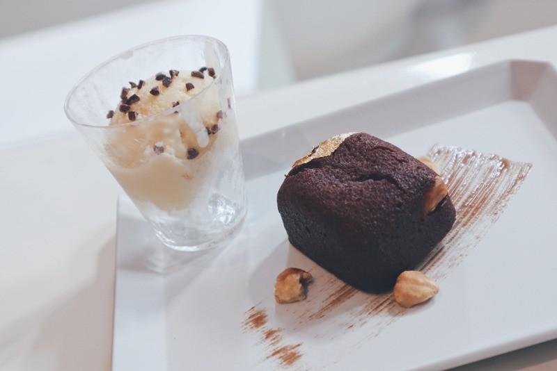 我和朋友吃完上面套餐後又覺得不過癮,因此又單點了兩道甜點,下面這個“巧克力榛果費南雪”榮登我當天心目中的第一名!一開始單獨擺放在櫃檯的時候沒有特別期待它的口感,但經過擺盤和加熱之後,一支下去我和朋友也是驚呼了一下,外酥內綿密的口感以及剛剛好的熱度讓這個費南雪的味道100分!而旁邊搭配的香草冰淇淋也很好吃,感覺比平常吃到的味道更加濃郁且香,和朋友一起分食不僅可以嘗到更多不同的甜點,這樣吃起來也比較不擔心會膩喔!