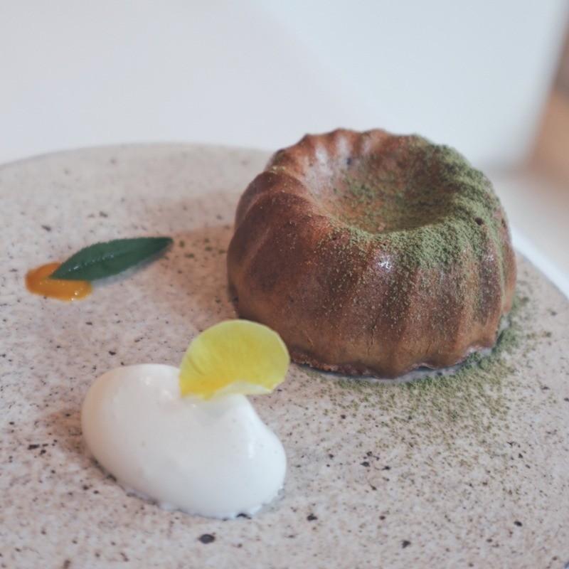 接下來上的也是必點店內甜點”Signature Mochi“,主要是用紅豆、煎茶、鮮奶油組成,名字看起來很日式,但擺盤卻很法式,讓我們非常好奇吃起來究竟如何,外皮是經過烤過酥脆口感,但裡面是有些Q的口感,內餡則是日式煎茶紅豆,可以沾著一旁的香緹鮮奶油,整體抹茶沒有我想像中的那樣重,我本身沒有喜歡抹茶或紅豆做的甜點,但這道甜點有了香緹鮮奶油以及外皮的味道做中和後,味道反而清爽又具有風味,且口感很好,雖然不一定下次來會再點,但很值得推薦喜歡抹茶紅豆的人點來吃。