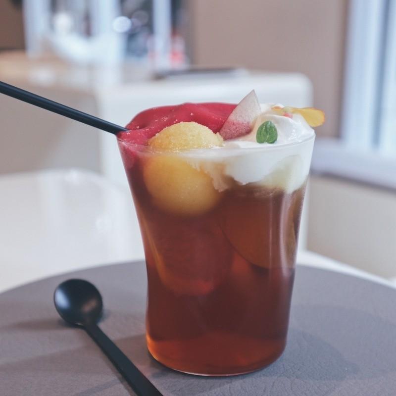 接著是Oth的招牌茶飲 “Chante Tea”,以水仙烏龍為底,上面放上香緹鮮奶油、芒果雪酪、莓果泡泡,以及季節水果切片,而這款杯子同樣出自日本職人手製的杯子也吸引我的注意,外型簡約好握,和手指粗細弧度非常合,整體杯子的弧度曲線非常美,透明茶杯可以直接看到茶色以及上面堆疊的東西,就蛋糕一樣有層次,店員在解說的時候也有建議我們先用吸管吸一口底下茶本身的味道,然後在用湯匙舀起上面的東西來吃,酸酸甜甜以及綿密的口感,感覺很像是在吃某種法式甜點,但底層又是中式的茶,這看似衝突的搭配結合在一起又非常好喝,整體喝起來很清爽,我自己也很喜歡這杯飲料,的確是一杯顏值和味道都很高的一杯飲品,也推薦第一次去的人要點來喝喝看。