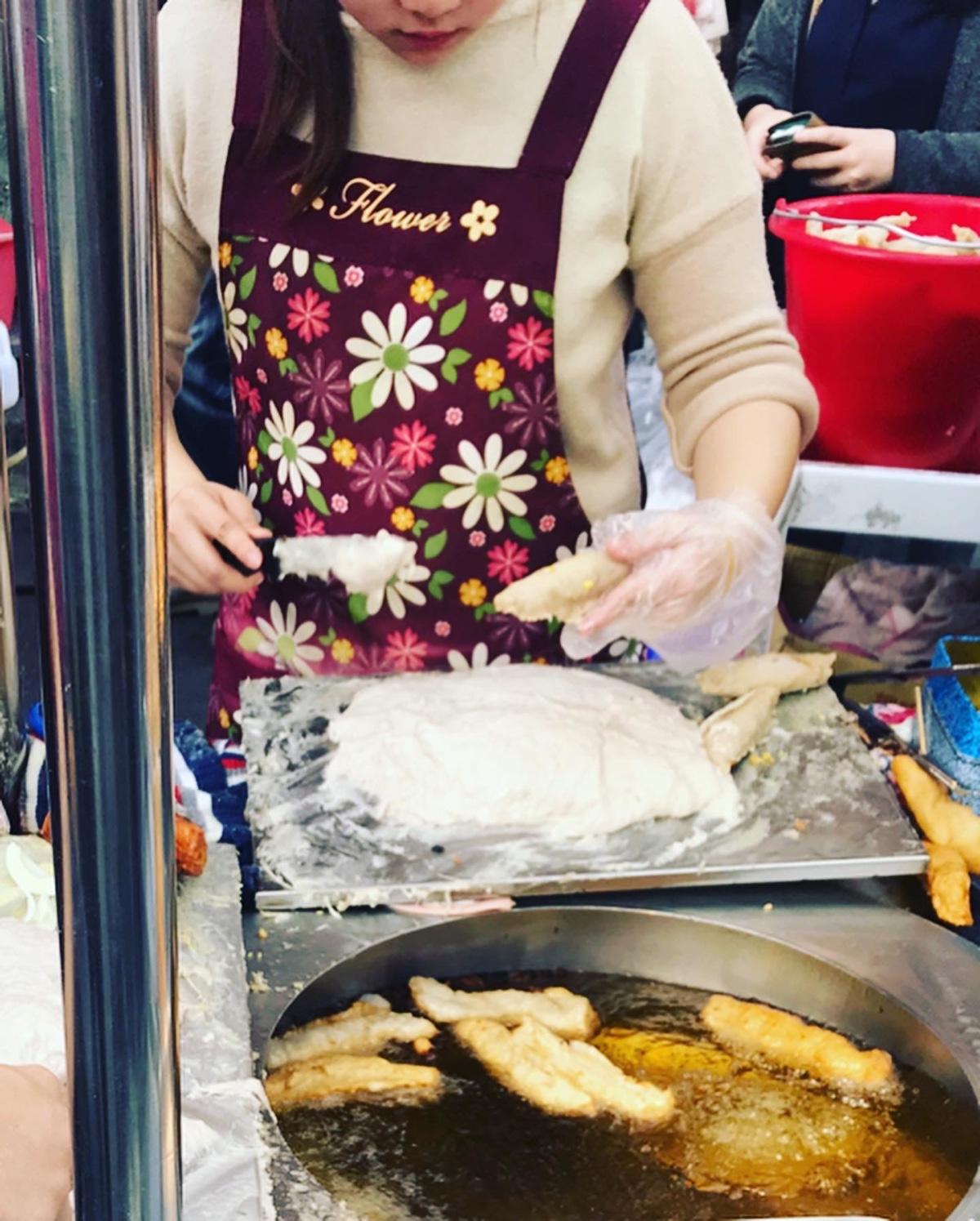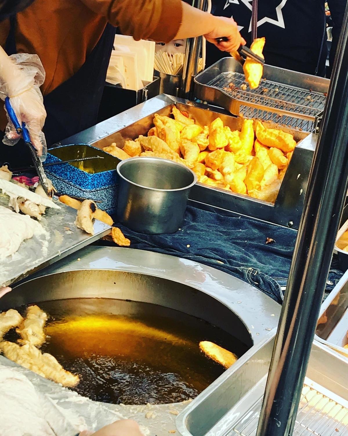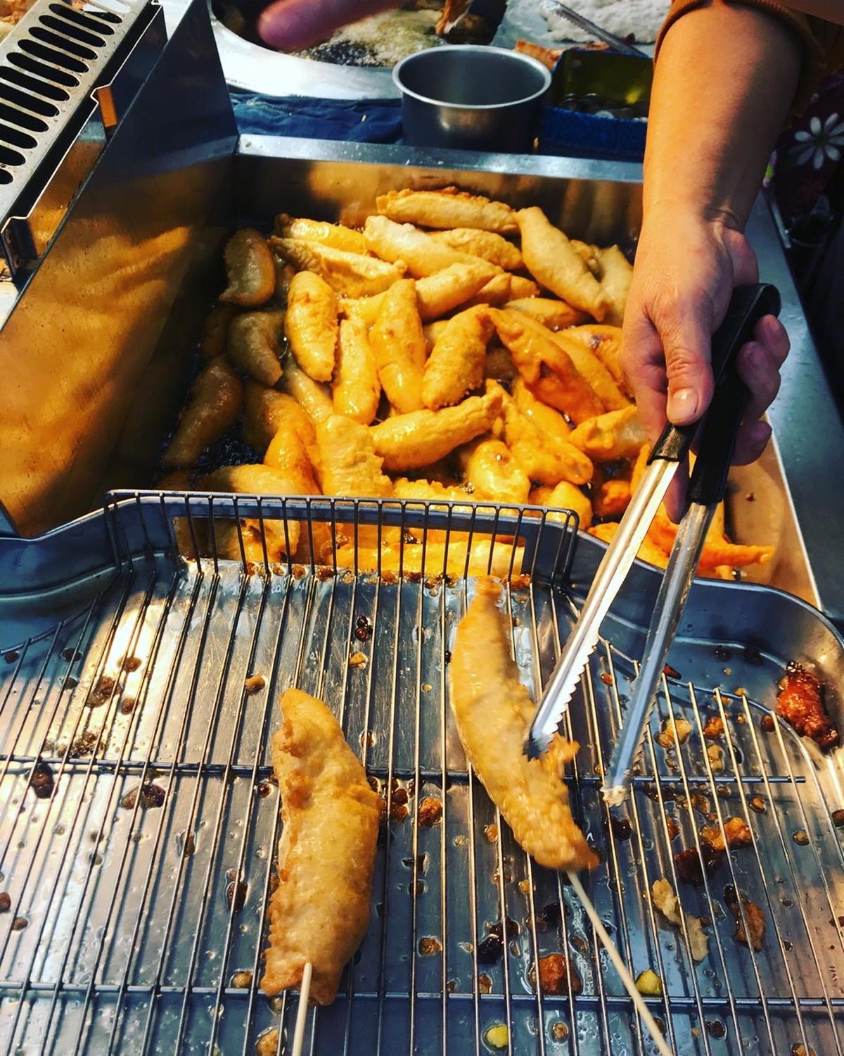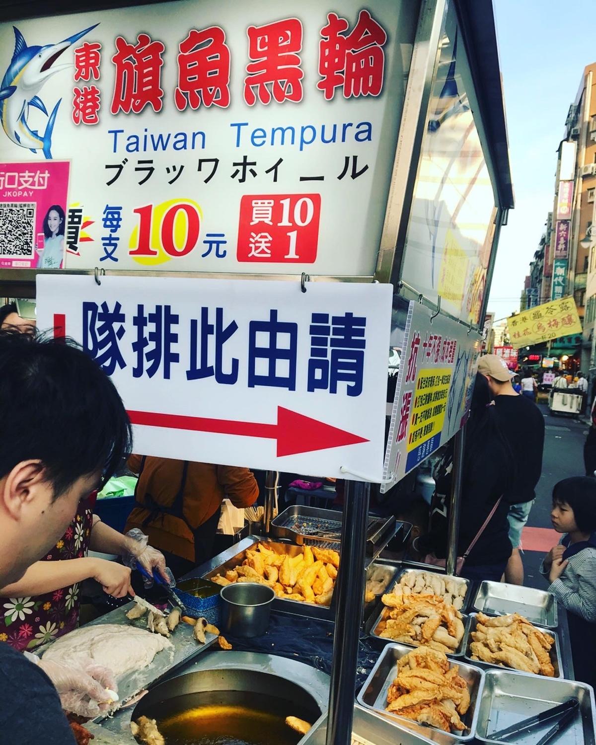 👄ㄧ間小小的攤位,經過會看見排隊人潮,一個個被送下油鍋的旗魚黑輪炸起來胖嘟嘟圓滾滾的,一起鍋淋上旁邊的醬料:甜辣醬&芥末醬,對!就是這個味道!天婦羅都會有的沾醬ㄧ搭上去就是無敵👍!