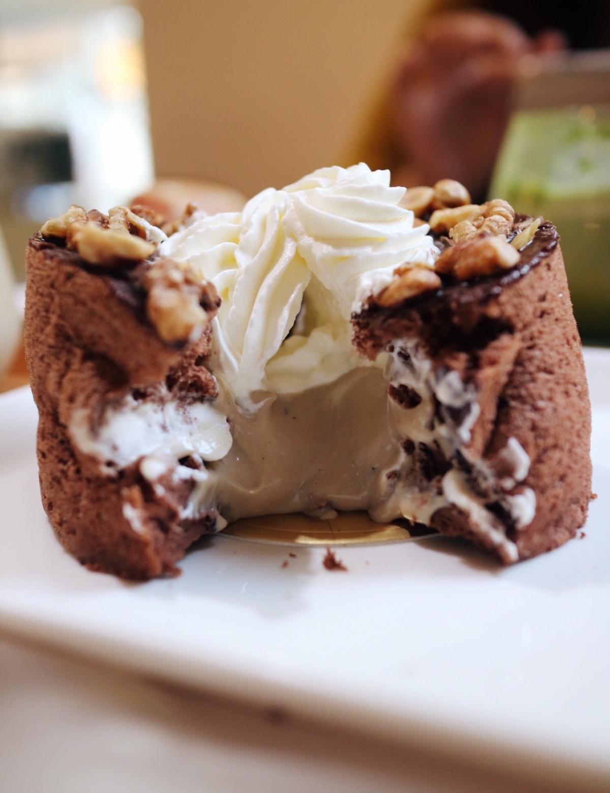 戚風蛋糕超級軟蓬鬆!刀子切下去他就整個歪腰,有點難切😳但是戚風裡面的伯爵餡配上巧克力醬和核桃真的好搭!