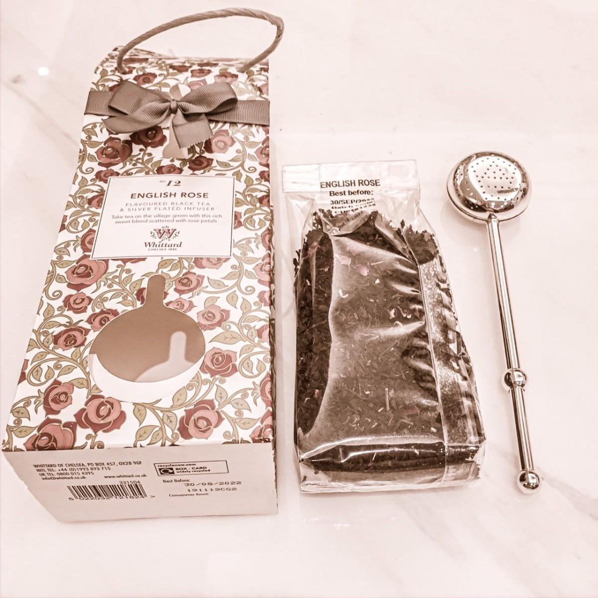 自1886年由創始人Walter Whittard在倫敦創立第一家專門店,現在台灣也有Whittard茶店,位於台北的微風南山,這家專賣店有賣散茶、茶包、即溶茶巧克力粉、茶具與杯具,我這次選購的是玫瑰茶濾茶器組!