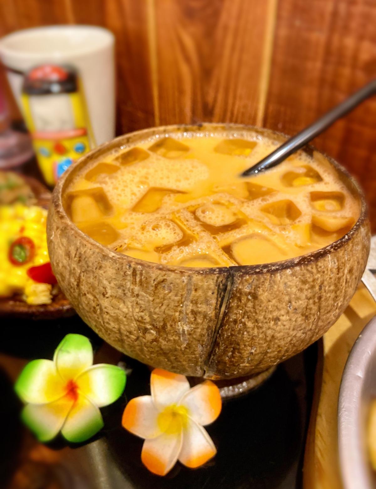 我最愛喝泰奶了,奶味雖不重但蠻香的,而裝的容器竟是一個椰子🥥,超可愛💕