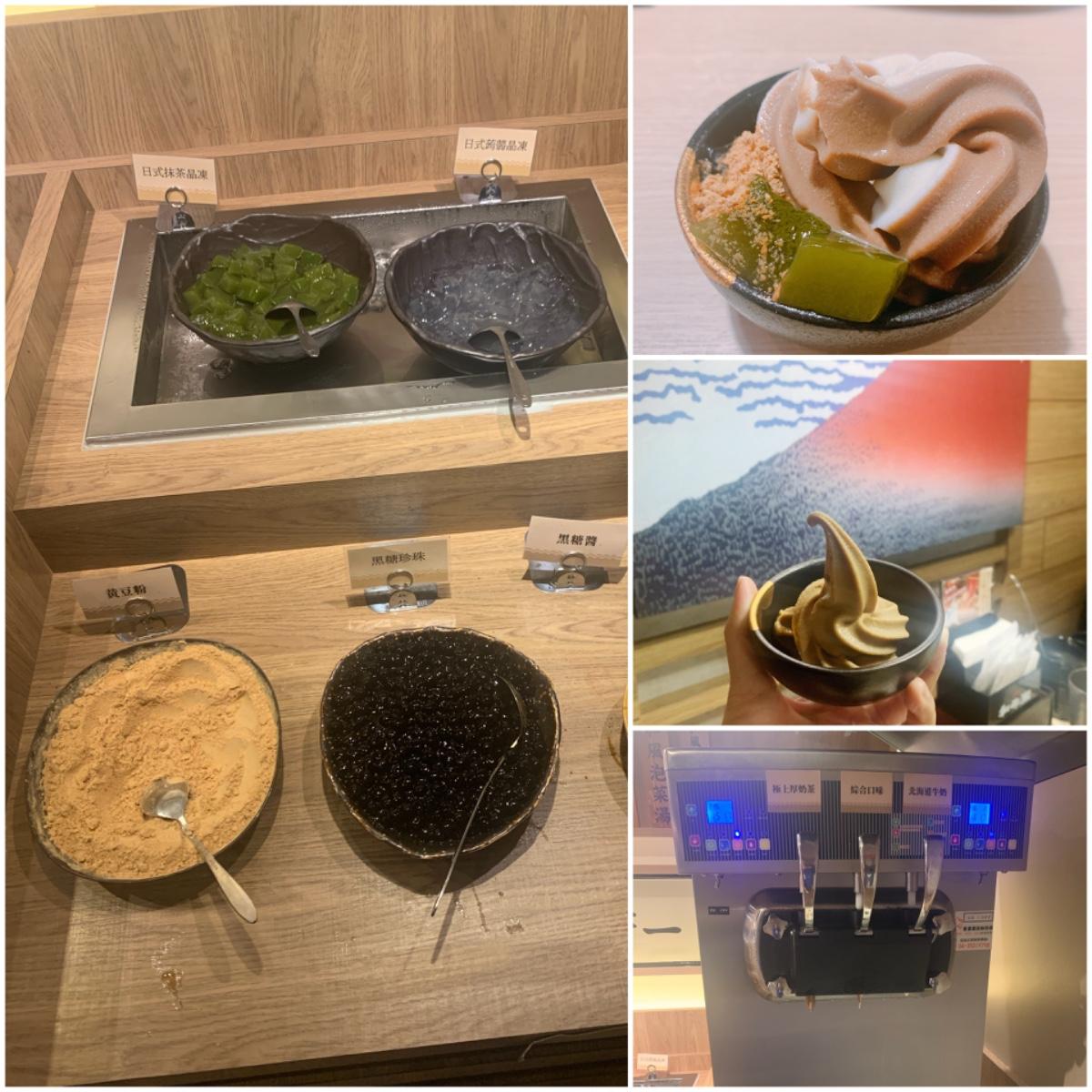 冰淇淋口味:極上厚奶茶、北海道牛奶、綜合、配料有黃豆粉、日式抹茶晶凍和黑糖珍珠