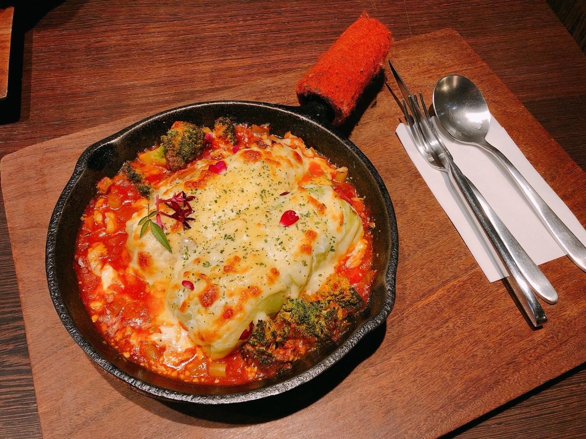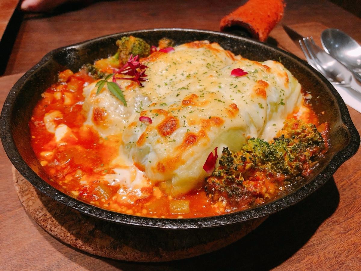 馬偕博士菜籽菜捲很特別!高麗菜捲裡包的是燉飯,外面的醬汁是蔬菜蕃茄熬煮的。
