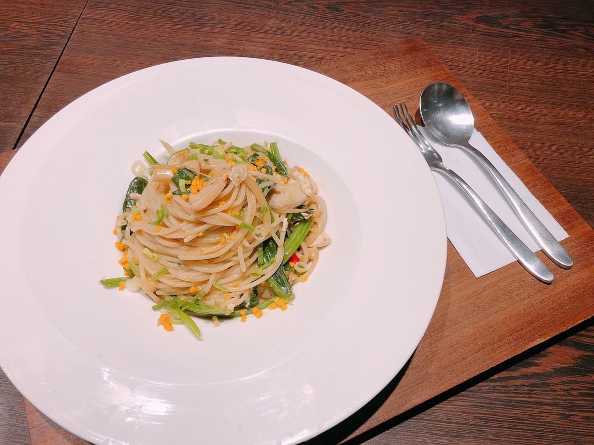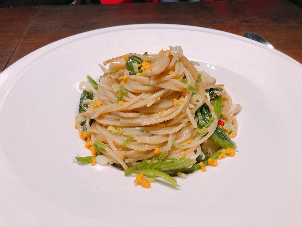 金沙菠菜清炒義大利麵使用在地的八里鹹蛋,沒想到可以跟菠菜還有義大利麵這麼搭😍