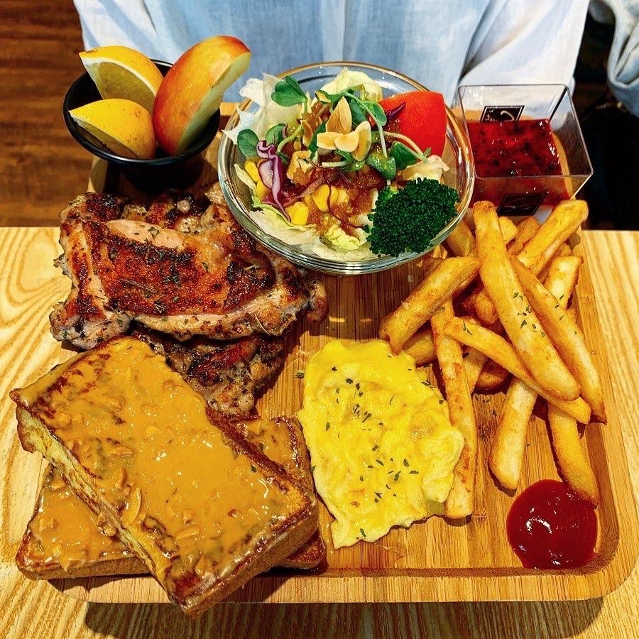✍🏻早午餐拼盤整個就很豐盛.雞腿排和蛋都有調味過了蠻好吃的.法式吐司上的花生醬是自製的有顆粒.香但蠻油的.環境還不錯