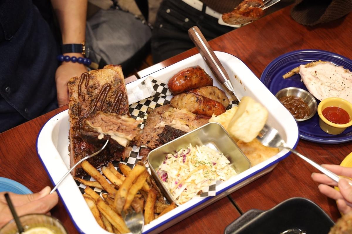 👉雙人分享M號餐(有手切薯條.煙燻慢烤豬肋排(半份).燻烤牛胸肉.自家製美式香腸.比司吉*3.捲心菜沙拉)