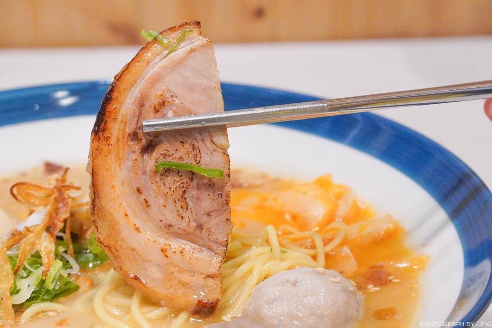 23私房拉麵的湯底是老闆自己研發的豚骨白湯為基底,再搭配上自己炒製蒜香蔥油再撒上蔥花,溏心蛋大氣的放上一顆,與兩種不同口味的貢丸,與兩片經過炙燒過的厚實叉燒,整碗麵賣相極佳,有種老闆獨特的粗獷美。