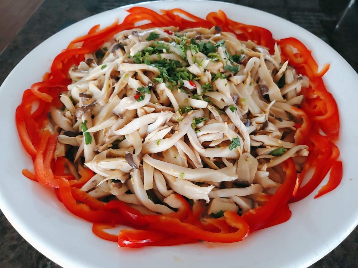 5.杏鮑菇絲呈盤後,淋上醬汁及灑上香菜,紅彩椒裝飾即完成