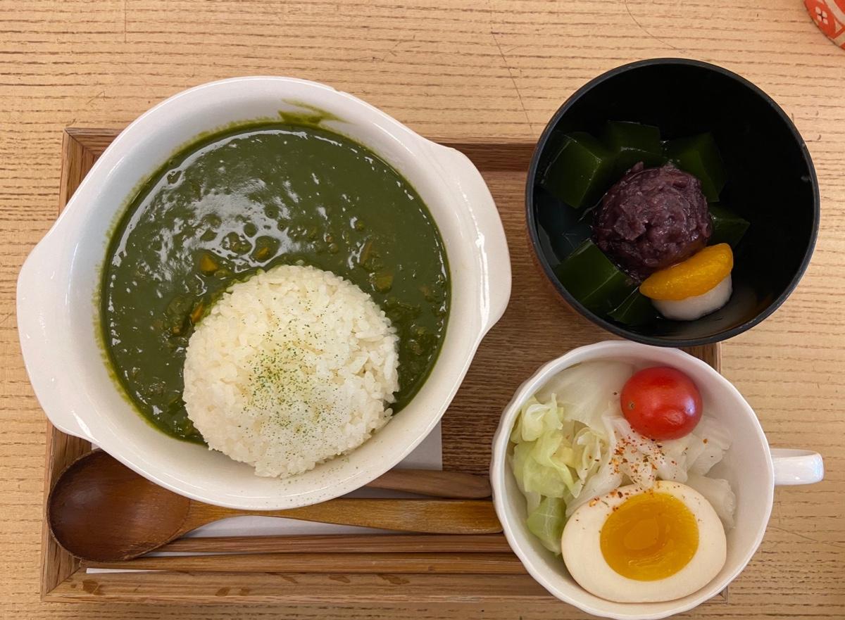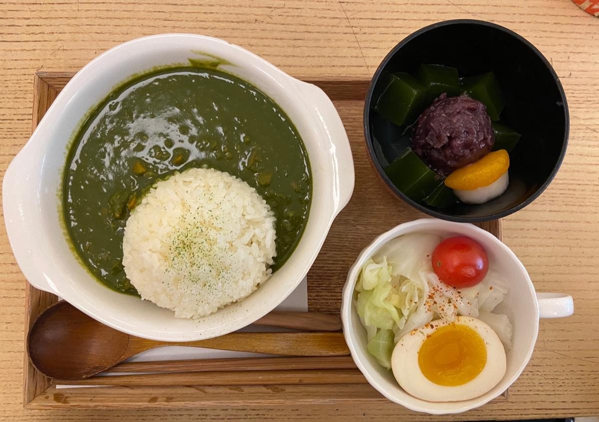 套餐含咖喱飯、青菜、抹茶甜品,抹茶甜品裡面有抹茶凍、寒天、蜜柑、蜜紅豆。抹茶咖喱的味道很特別,剛入口的時候覺得咖喱味很香,可是後來茶的苦味就會跑出來,是微苦微苦的咖喱,如果不是很喜歡抹茶的人應該不能接受吧,青菜真的很普通,就是水煮青菜配上半顆水煮蛋跟一顆小番茄,是完全沒有調味的。