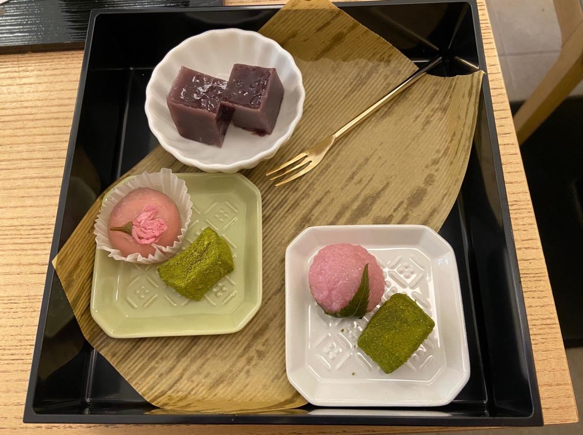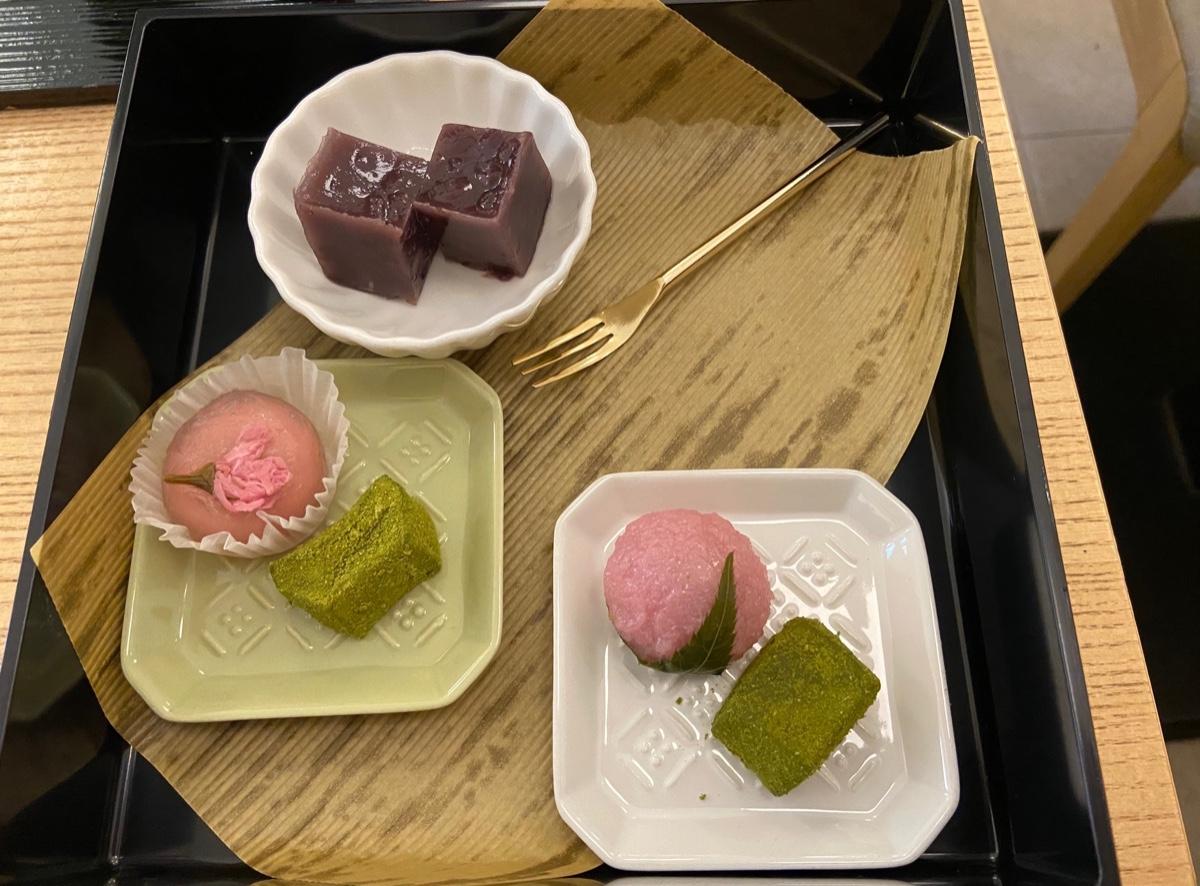 下午茶套餐有櫻餅、櫻花葛餅、抹茶蕨餅、紅豆羊羹,茶有分三個等級:無上$320、玉露$300、煎茶$290。最近櫻花季開始了,櫻花甜點都是從日本空運來台的,每日限量售完為止,空運的櫻餅、葛餅、蕨餅、讓大家一次享受道地的日式甜點!我覺得櫻花葛餅很好吃,淡淡的鹽漬櫻花味道我很喜歡,是Q彈清爽的日式甜點,抹茶蕨餅也很棒,黃豆粉的味道配上抹茶真的很搭🥰