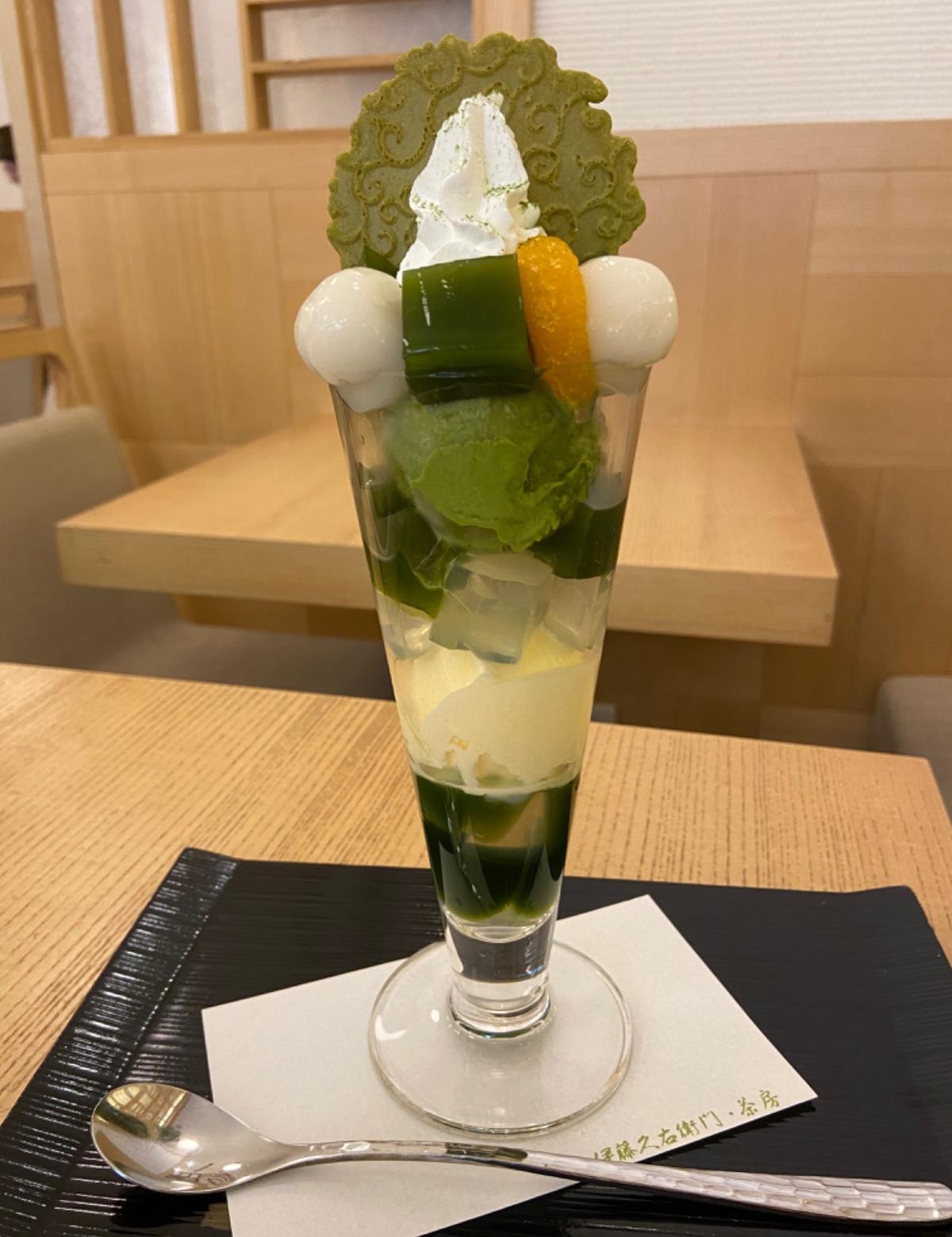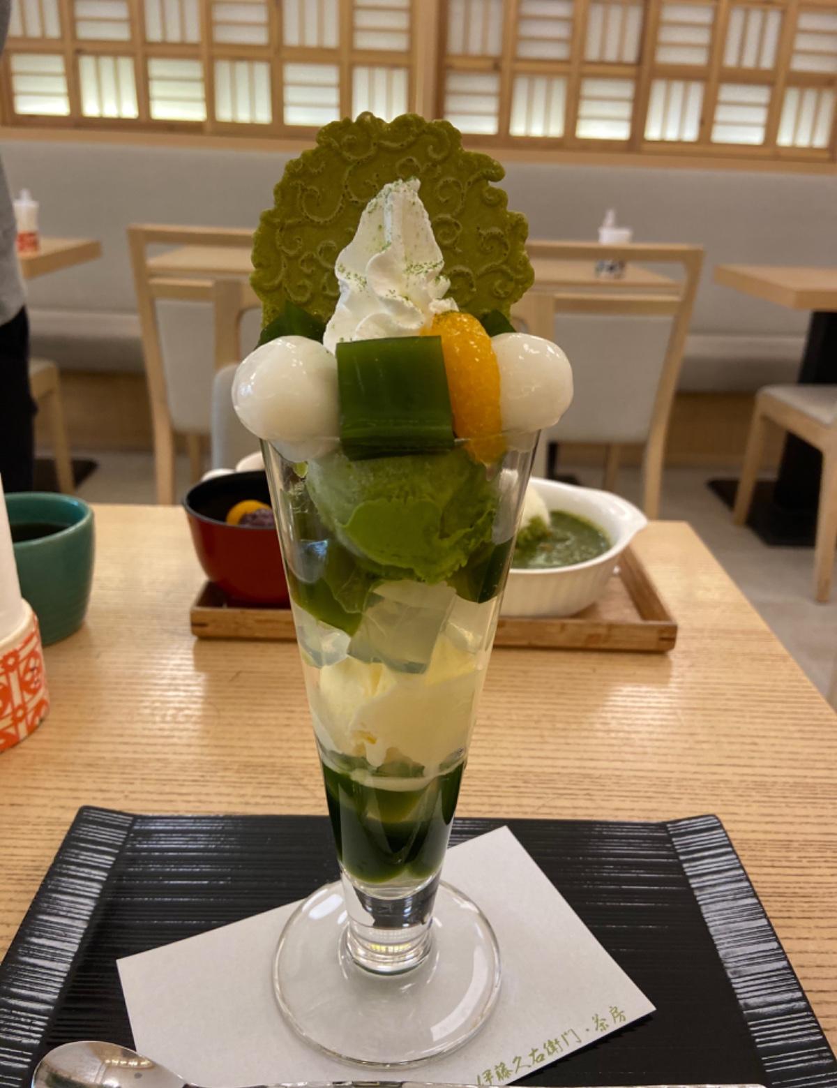 這是店內的明星商品,內含日本進口抹茶仙貝、蜜柑、鮮奶油、手工白玉、手工熬煮蜜紅豆、抹茶冰淇淋、香草冰淇淋、抹茶凍、寒天、抹茶蜜,一份甜點裡面可以享用的各種味道,非常超值!本來覺得仙貝很普通,可是吃起來比我想像中的好吃,茶味濃郁可口,搭配微甜的鮮奶油很好吃😋抹茶冰淇淋跟抹茶凍沒什麼甜味,但是抹茶味很重,我覺得非常好吃,香草冰淇淋及蜜紅豆甜而不膩,在整杯抹茶芭菲裡有畫龍點睛的效果😍
