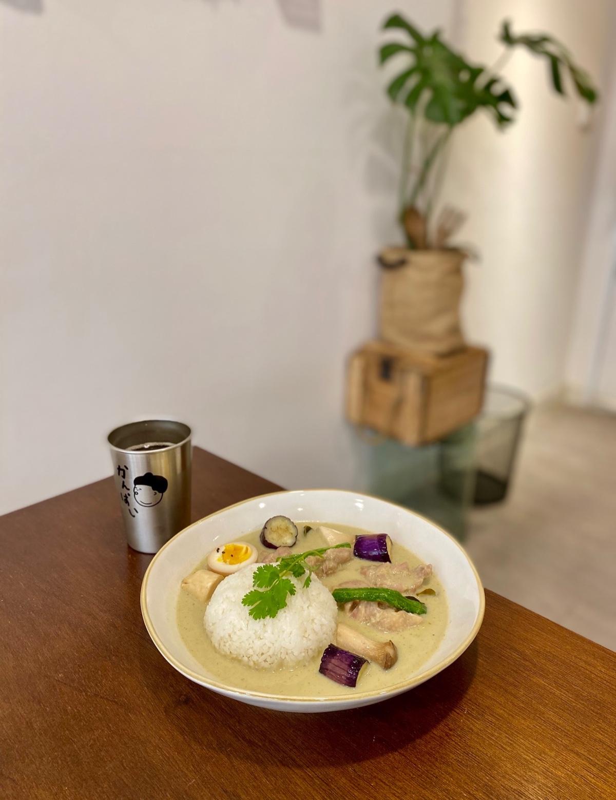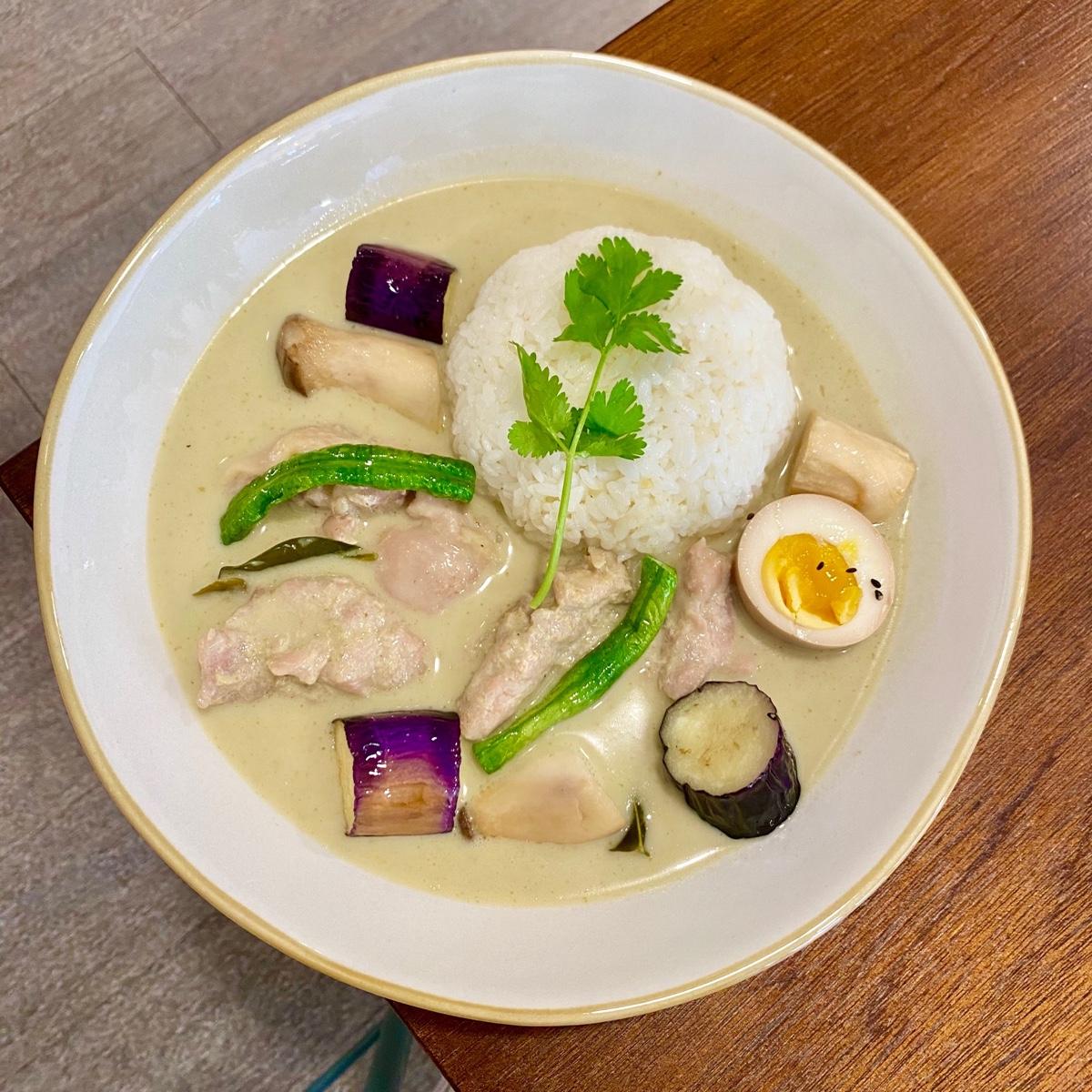 雞肉綠咖喱裡面有茄子 杏鮑菇 半顆溏心蛋 四季豆