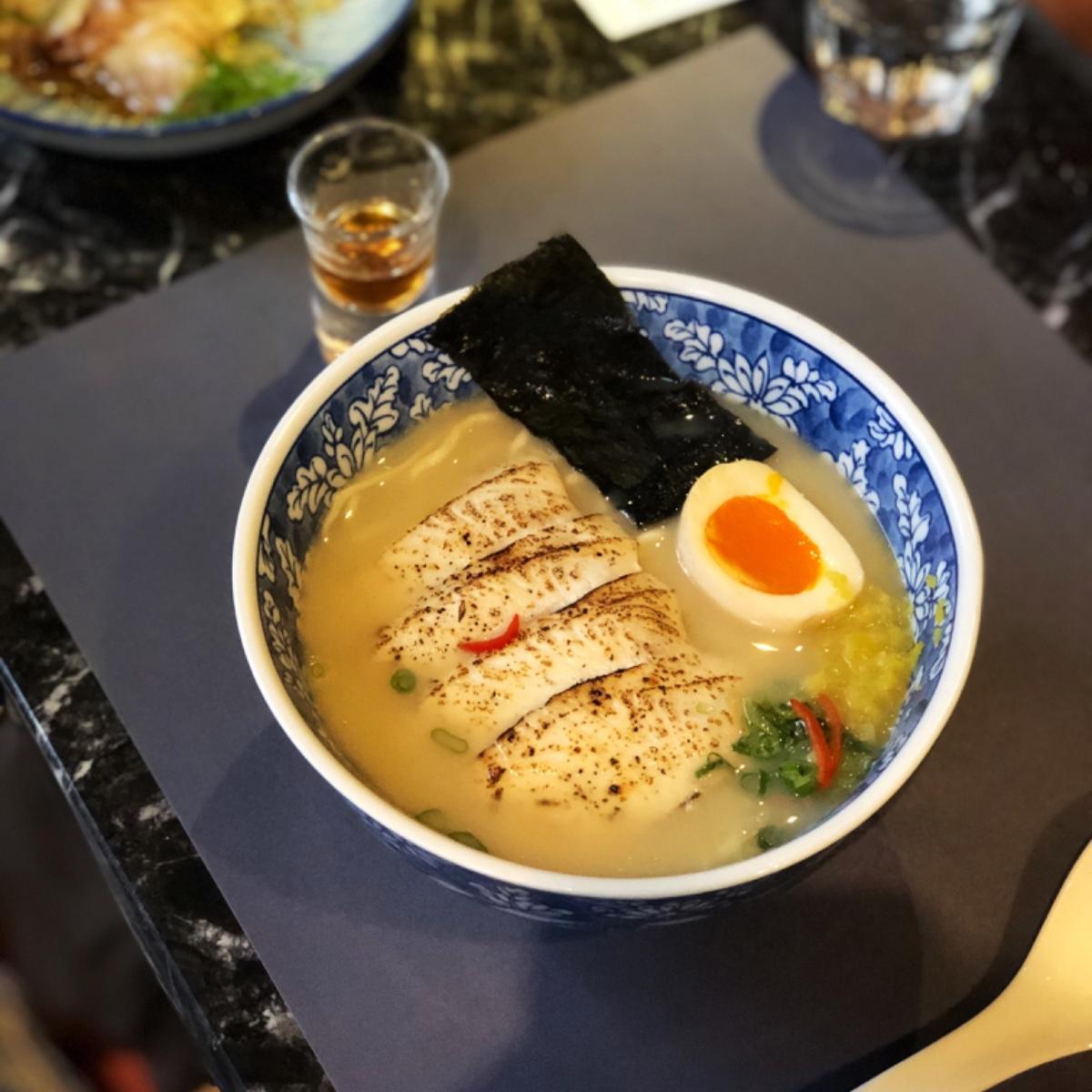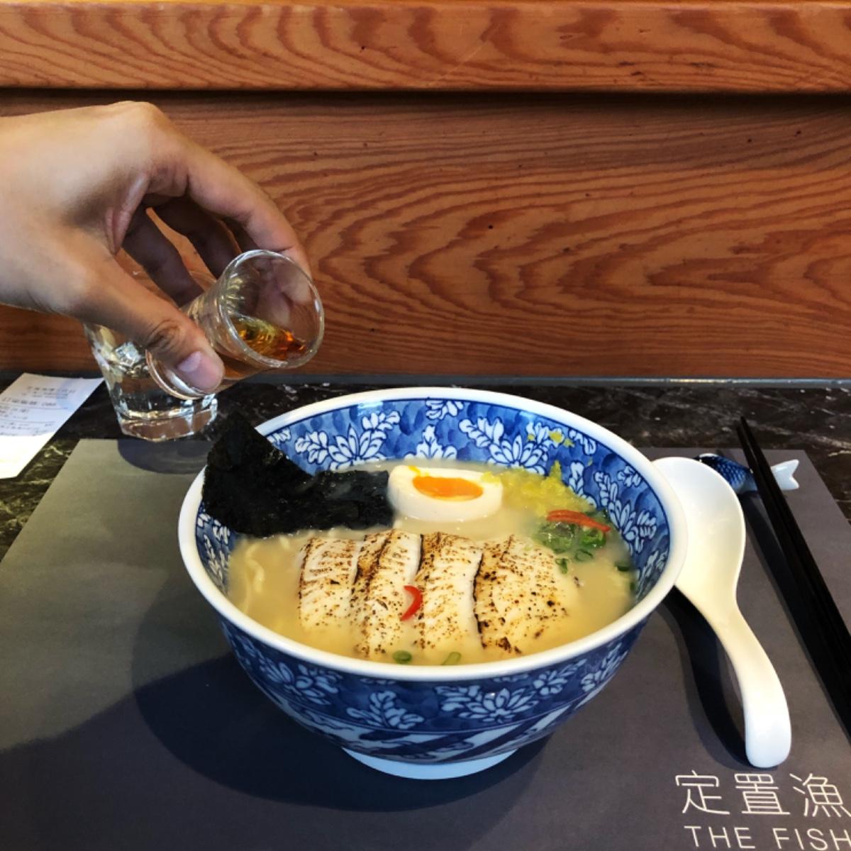 倒入白蘭地,溢滿酒香的魚湯更提高了一個口感層次。炙燒魚片富有彈性,感覺吃了滿滿的膠原蛋白。整體而言,最令人印象深刻的是溏心蛋,軟嫩不腥,整碗麵味道偏清淡👌