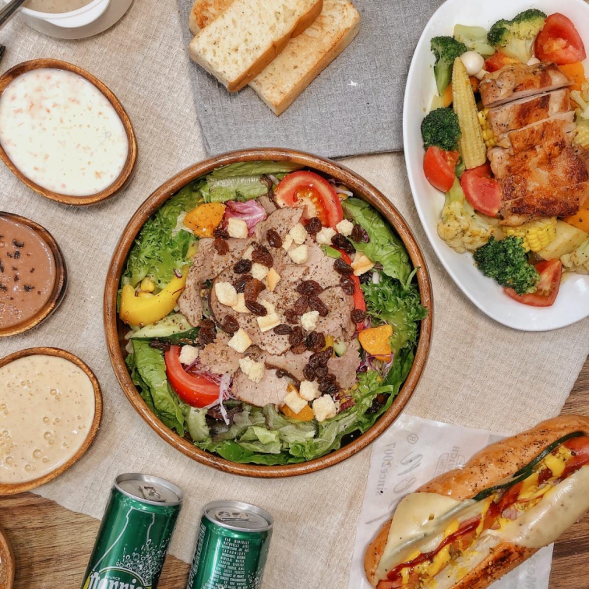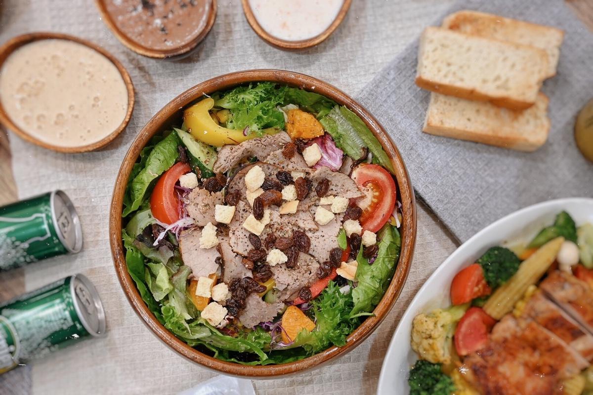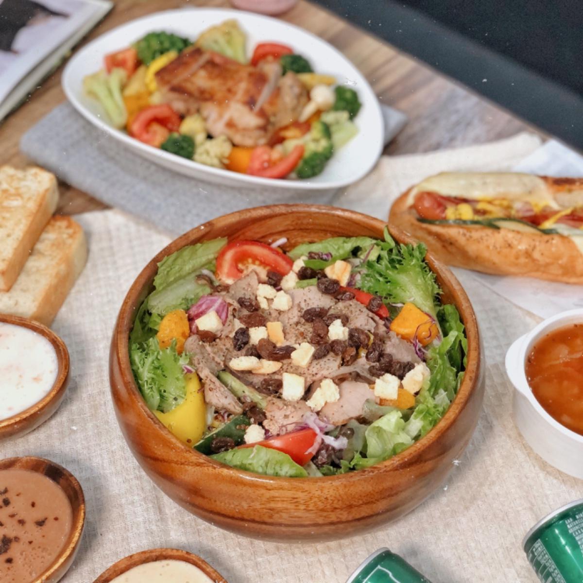 沙拉含生菜、黃瓜、彩椒、藜麥、玉米、紫衣甘藍等,鮮甜脆口不會有土味!沙拉真的大推👍🏻很好吃