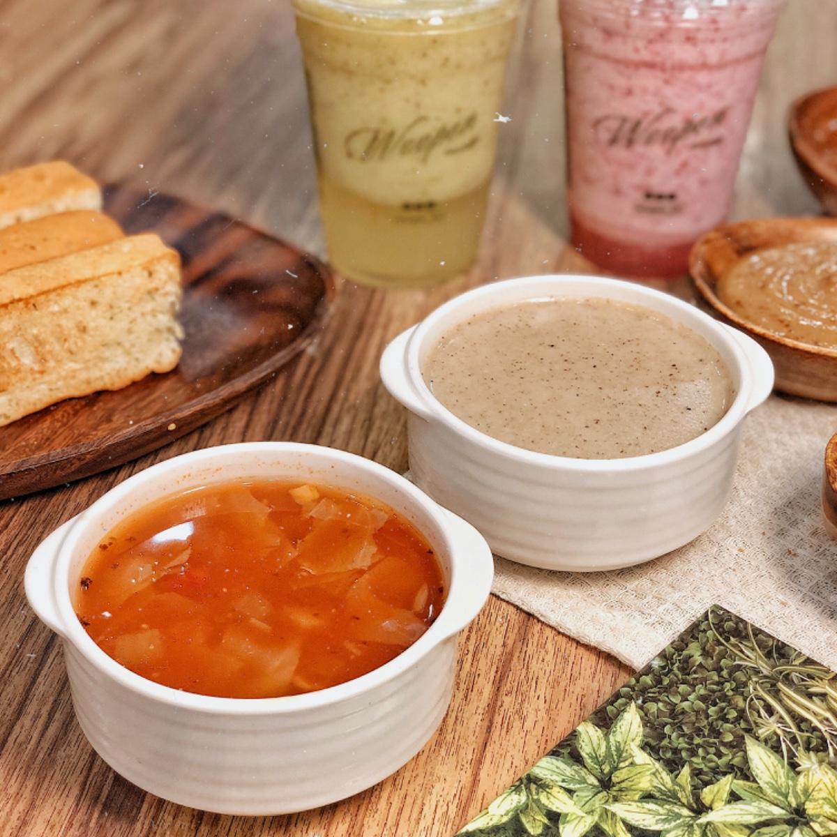 蕃茄蔬菜湯有濃濃蕃茄滋味,喝起來清爽又健康,加上洋蔥、蕃茄、培根等,每口都吃的到配料。野菇濃湯將綜合菇、培根、洋蔥磨碎,濃稠的湯頭帶有奶油菇香的法式滋味,熱熱喝好暖胃。