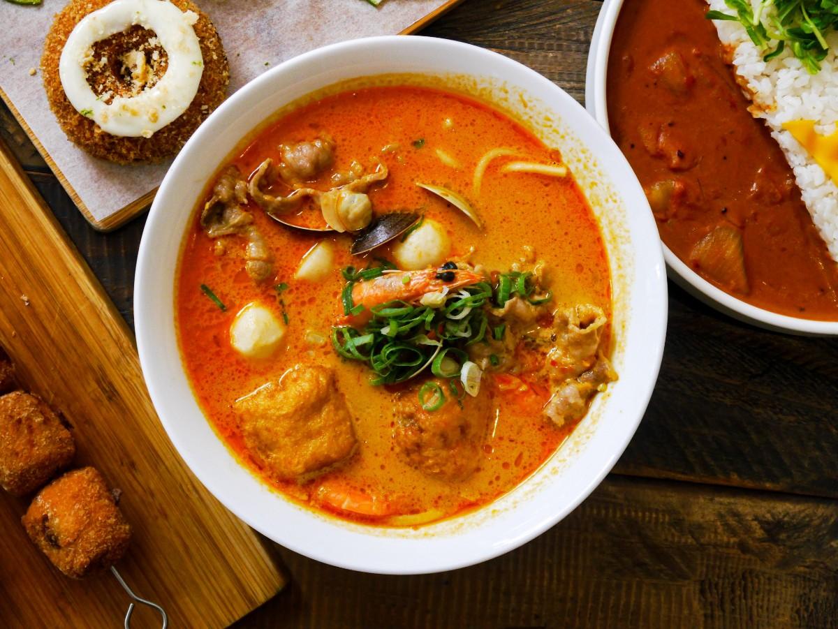 叻沙香氣很濃郁,加了醬油又是一番風味,裡面有三隻蝦、三顆蛤蜊跟一顆干貝、小小透抽等等,還有不少的肉片以及火鍋料,而加了金桔之後,更帶出了明顯的酸香與桔香