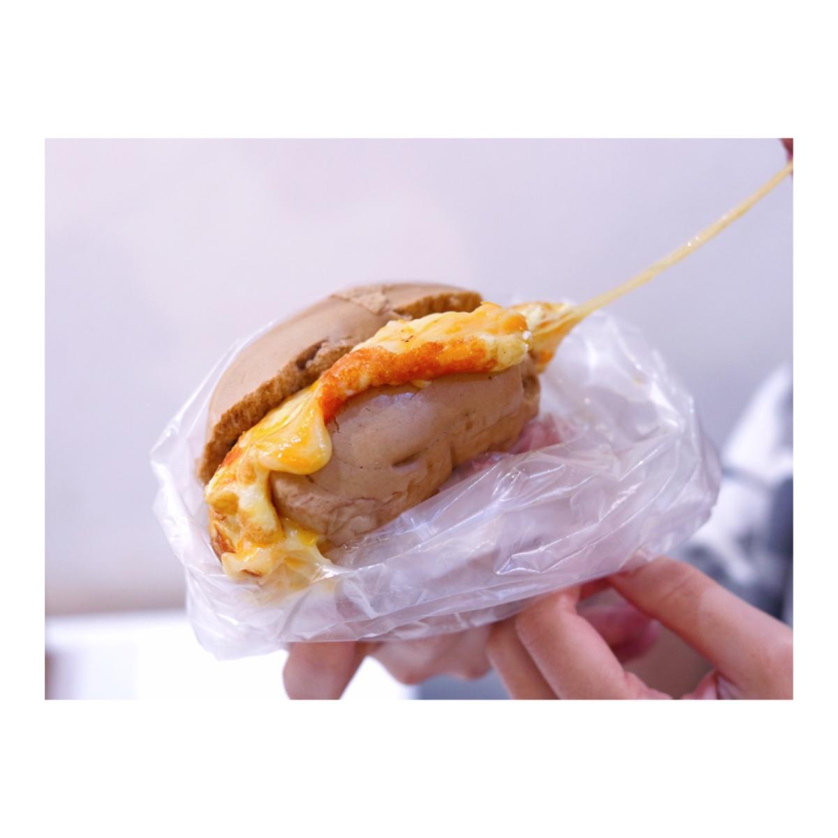 另外是沒什麼人介紹但我們覺得非常好吃的饅頭蛋加起司,大個頭的饅頭加入滿滿餡料,紮實飽足的口感讓我們一致推薦!豬排經過醃製,和煎得酥脆的蛋餅很是速配,一整塊甚至重到有點難夾起來,味道也好吃!