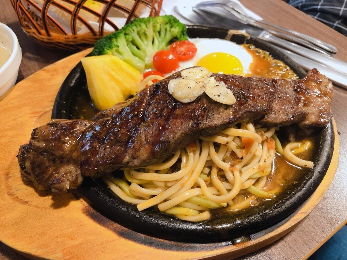 長長一條很跨南北半球!?的牛排,上方看得出一條條烙印的美麗焦痕,恰到好處的7分熟,讓牛肉軟嫩不血實(可以喜好調整5分、7分、9分),